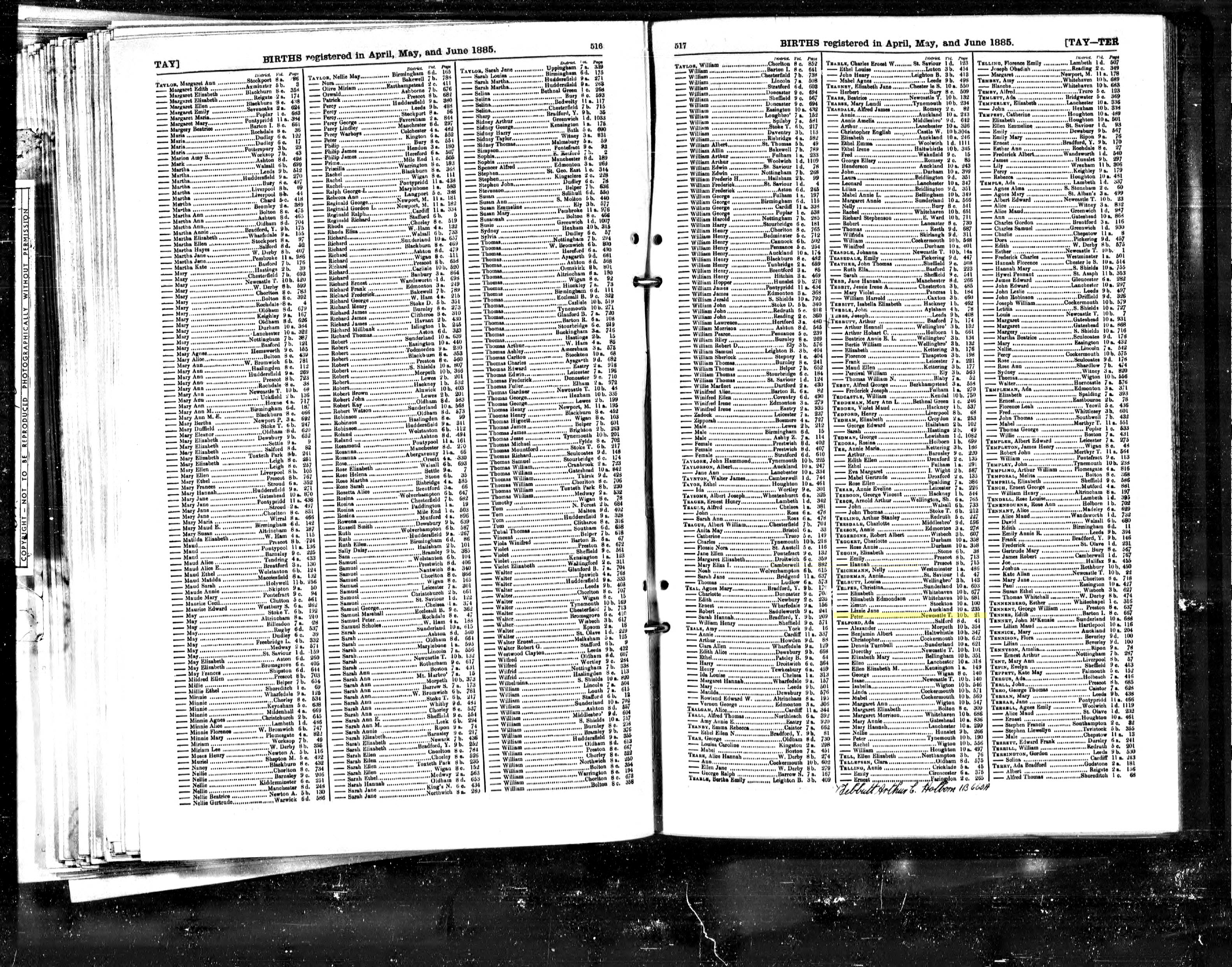| Birth* | 1885 | Peter Telfer was born in 1885 at Newcastle upon Tyne, Northumberland, England; Apr-May-Jun Qu.2 |