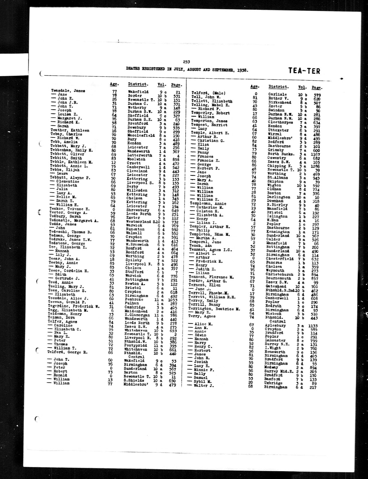 | Death* | Se Qu 1938 | Peter Telfer died Se Qu 1938 at Northumberland, England; Northumberland West.5 |
