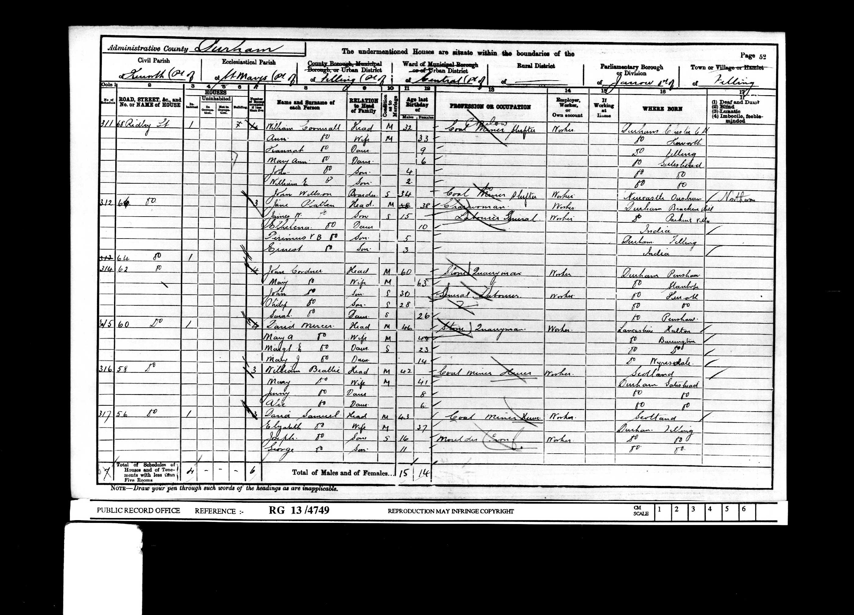 | (Witness) Census 1901 | 31 March 1901 | Mary Sarah Crawhall appeared in the household of John Robinson Cordner in the 1901 census at 62 Ridley Street, Heworth, Gateshead, Co Durham Co Durham, England. Phillis appears on this census as a son Philip although all evidence points to this being Phillis.11 1901 census transcription details for: 62, Ridley Street, Heworth, Felling National Archive Reference: RG number: RG13 Piece: 4749 Folio: 110 Page: 52 Reg. District: Gateshead Sub District: Heworth Parish: Heworth Enum. District: 17 Ecclesiastical District: St Marys City/Municipal Borough: Address: 62, Ridley Street, Heworth, Felling County: Durham Name Relation Condition Sex Age BirthYear Occupation ,Disability Where Born CORDNER, John Head Married M 60 1841 Stone Quarry Man Penshaw Durham CORDNER, Mary Wife Married F 63 1838 Stanhope Durham CORDNER, John Son Single M 30 1871 General Labourer Heworth Durham CORDNER, Philip Son Single M 28 1873 Heworth Durham CORDNER, Sarah Daughter Single F 26 1875 Penshaw Durham RG number: RG13 Piece: 4749 Folio: 110 Page: 52 Registration District: Gateshead Sub District: Heworth Enumeration District: 17 Ecclesiastical Parish: St Marys Civil Parish: Heworth Municipal Borough: Address: 62, Ridley Street, Heworth, Felling County: Durham © findmypast.co.uk |