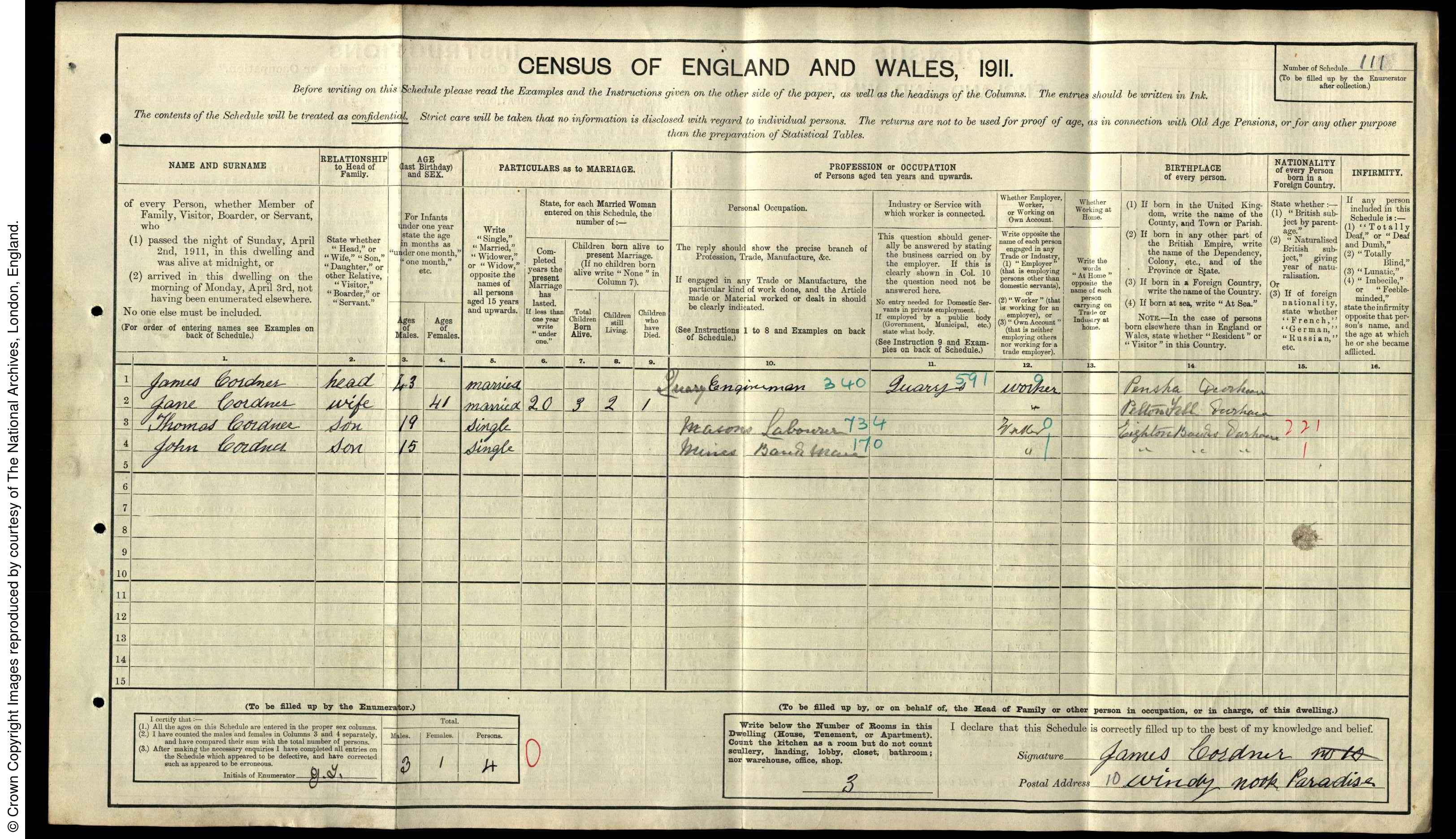 | (Witness) Census 1911 | 2 April 1911 | Mary Sarah Crawhall appeared on the census of 2 April 1911 in the household of John George Cordner at 6 Salisbury Street, Pelaw on Tyne, Co Durham, England; Census gives name as Tom George but felt to be John George.12 |