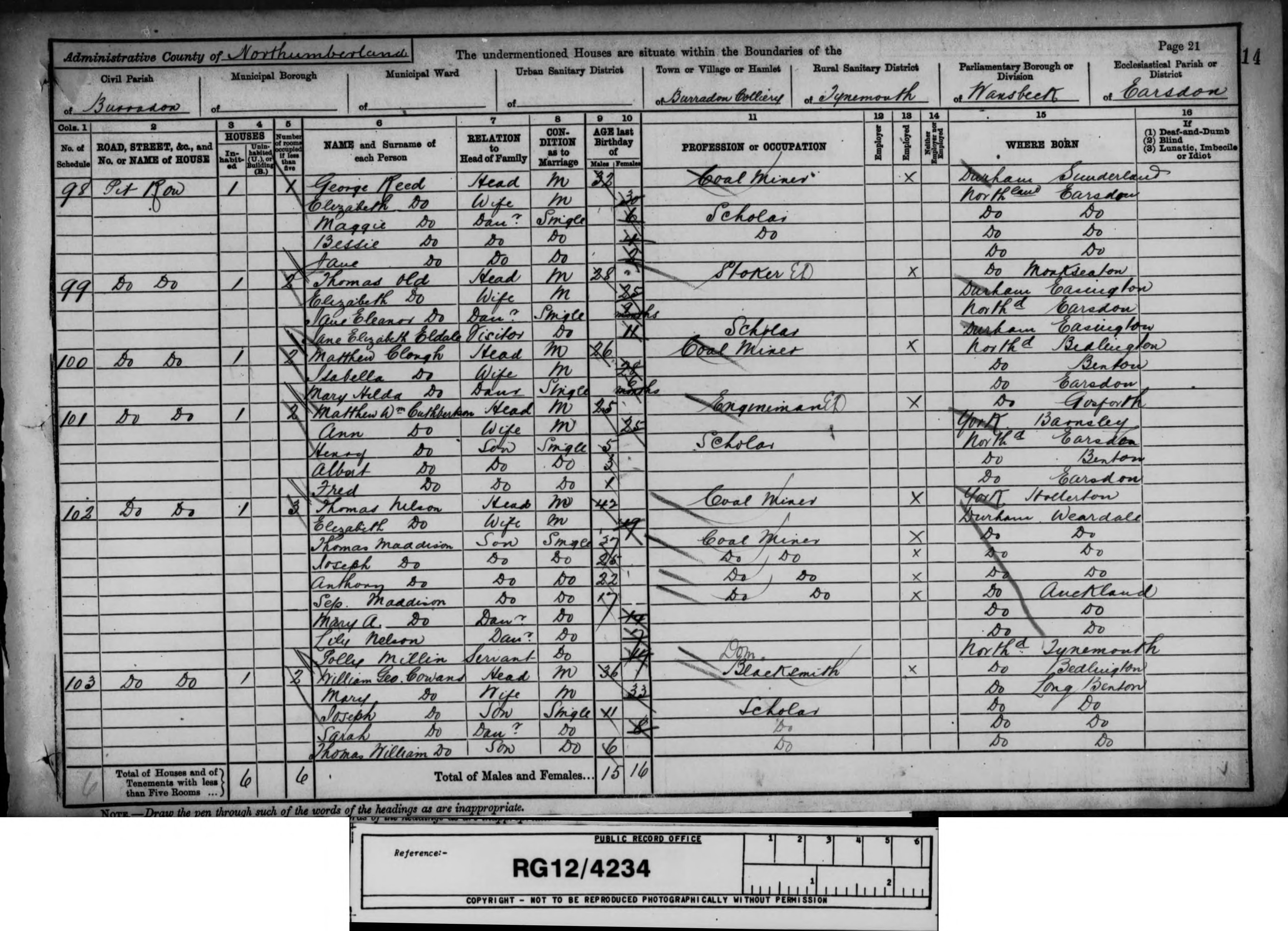 - [S443] 1901 Census Tynemouth, 1901 census transcription details for: Pit Row, Burradon