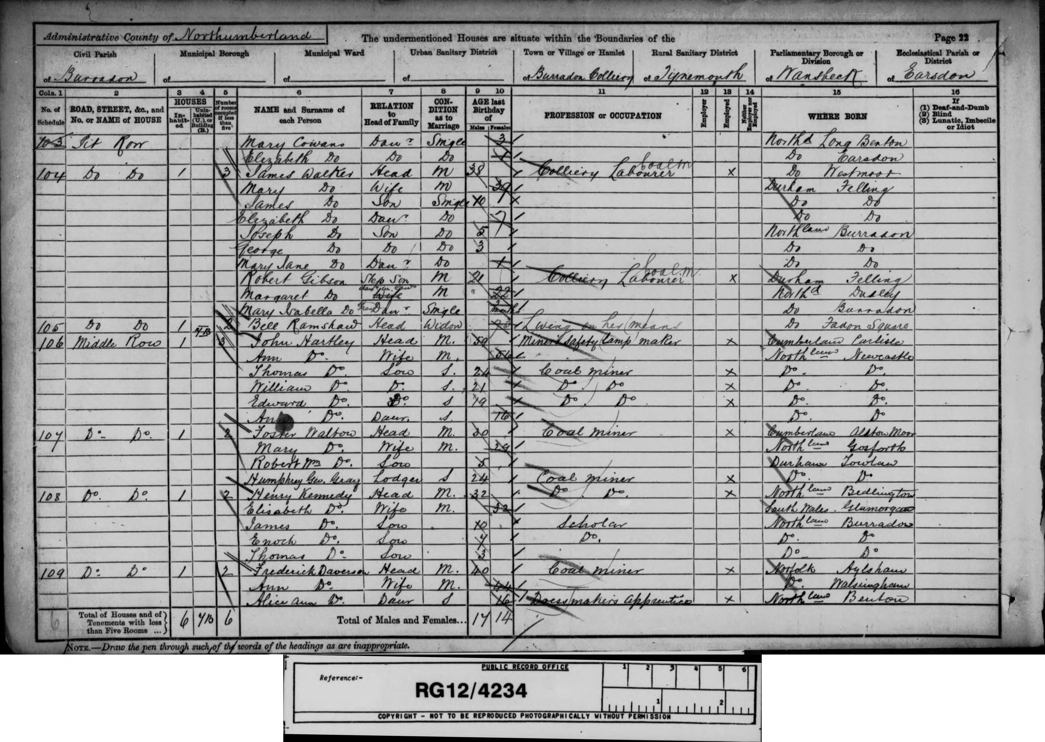 1911 census transcription details for: Pit Row Burradon Dudley S O Northumberland