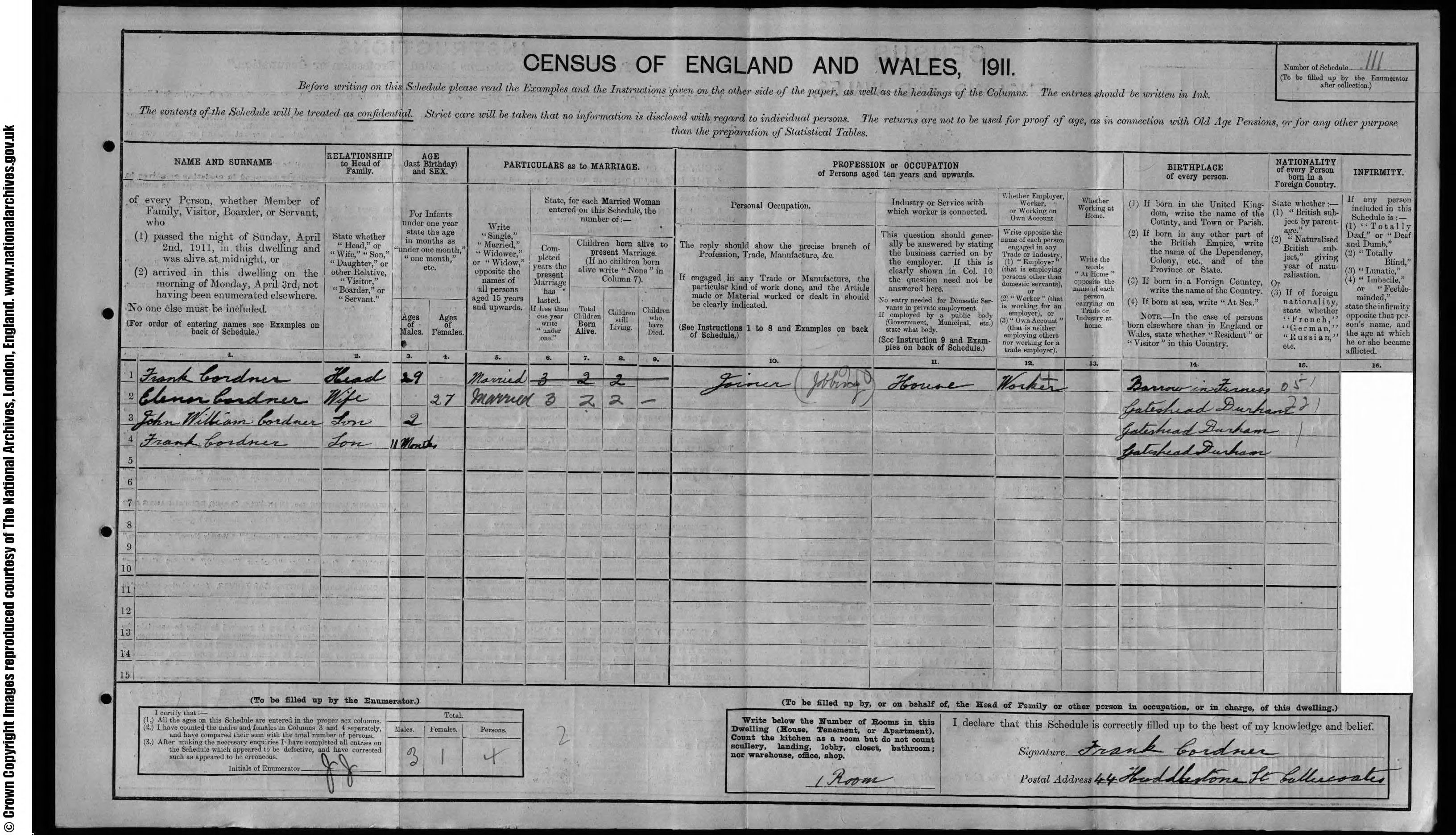 - [S471] 1911 Census Newcastle upon Tyne, 1911 Census Thomas Hodgson Cordner