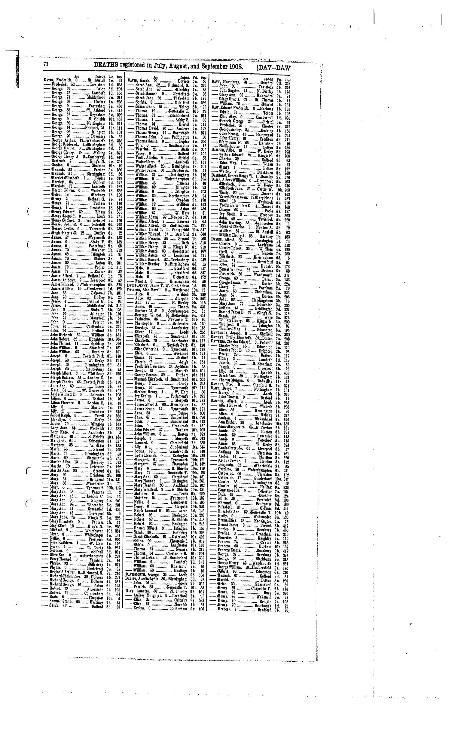 | (Witness) Census 1881 | 3 April 1881 | Robert Davison appeared in the household of Thomas Davison in the 1881 census at 22 Derwentwater Road, Gateshead, Co Durham, England. Dwelling: 22 Derwentwater Rd Census Place: Gateshead, Durham, England Source: FHL Film 1342213 PRO Ref RG11 Piece 5033 Folio 111 Page 3 Marr Age Sex Birthplace Thomas DAVISON M 61 M Sedgefield, Durham, England Rel: Head Occ: Retired Colliery Viewer Mary A. DAVISON M 61 F Ovingham, Northumberland, England Rel: Wife Occ: Retired Colliery Viewer Wife John DAVISON U 34 M Rainton Gate, Durham, England Rel: Son Occ: Unemployed Joiner William DAVISON U 27 M Wolsingham, Durham, England Rel: Son Occ: Butcher Elizabeth DAVISON U 25 F Wolsingham, Durham, England Rel: Daur Robert DAVISON U 19 M Wolsingham, Durham, England Rel: Son Occ: Unemployed Grocer Matthew C. DAVISON U 16 M Wolsingham, Durham, England Rel: Son Occ: Draper.3 Dwelling: 22 Derwentwater Rd Census Place: Gateshead, Durham, England Source: FHL Film 1342213 PRO Ref RG11 Piece 5033 Folio 111 Page 3 Marr Age Sex Birthplace Thomas DAVISON M 61 M Sedgefield, Durham, England Rel: Head Occ: Retired Colliery Viewer Mary A. DAVISON M 61 F Ovingham, Northumberland, England Rel: Wife Occ: Retired Colliery Viewer Wife John DAVISON U 34 M Rainton Gate, Durham, England Rel: Son Occ: Unemployed Joiner William DAVISON U 27 M Wolsingham, Durham, England Rel: Son Occ: Butcher Elizabeth DAVISON U 25 F Wolsingham, Durham, England Rel: Daur Robert DAVISON U 19 M Wolsingham, Durham, England Rel: Son Occ: Unemployed Grocer Matthew C. DAVISON U 16 M Wolsingham, Durham, England Rel: Son Occ: Draper |
