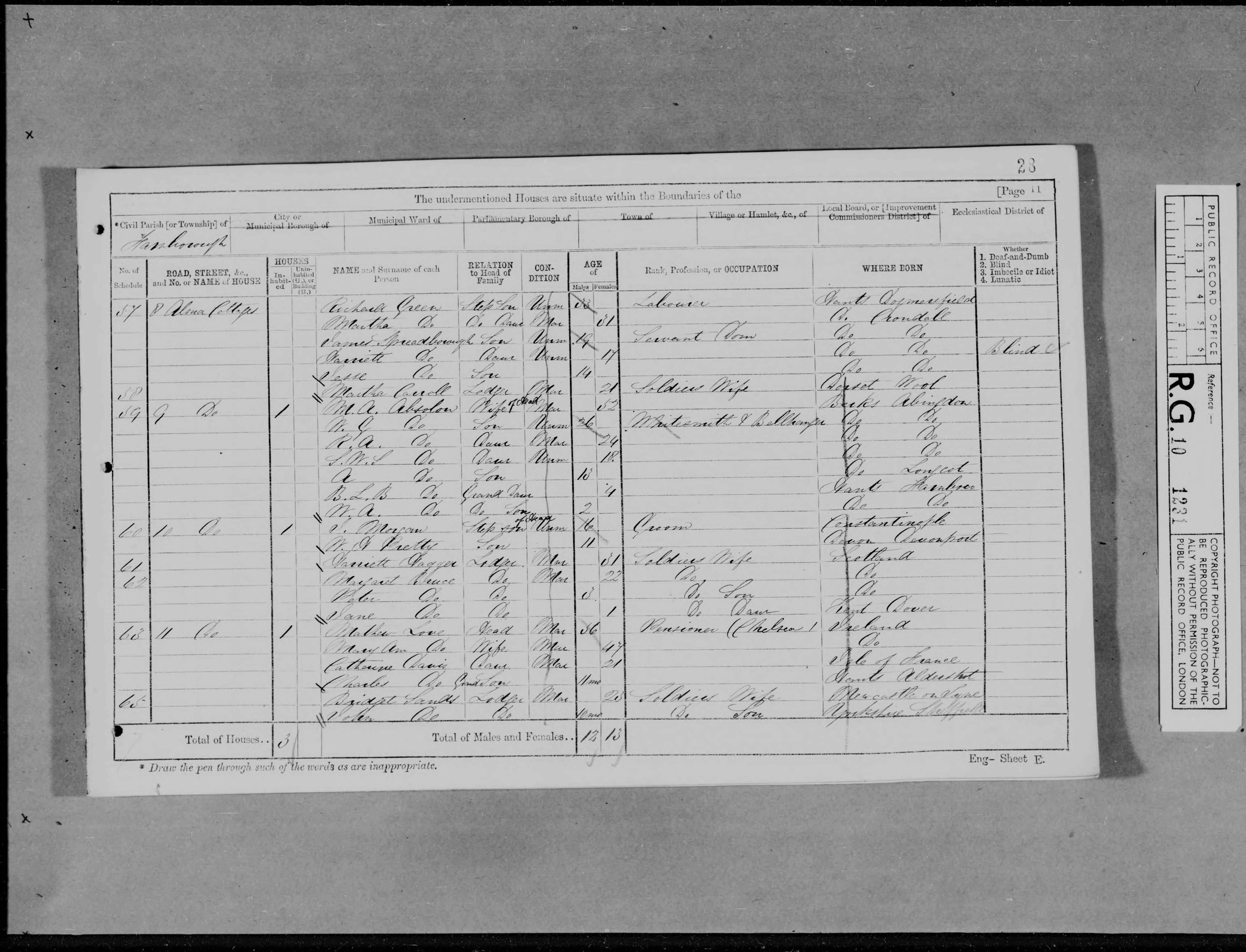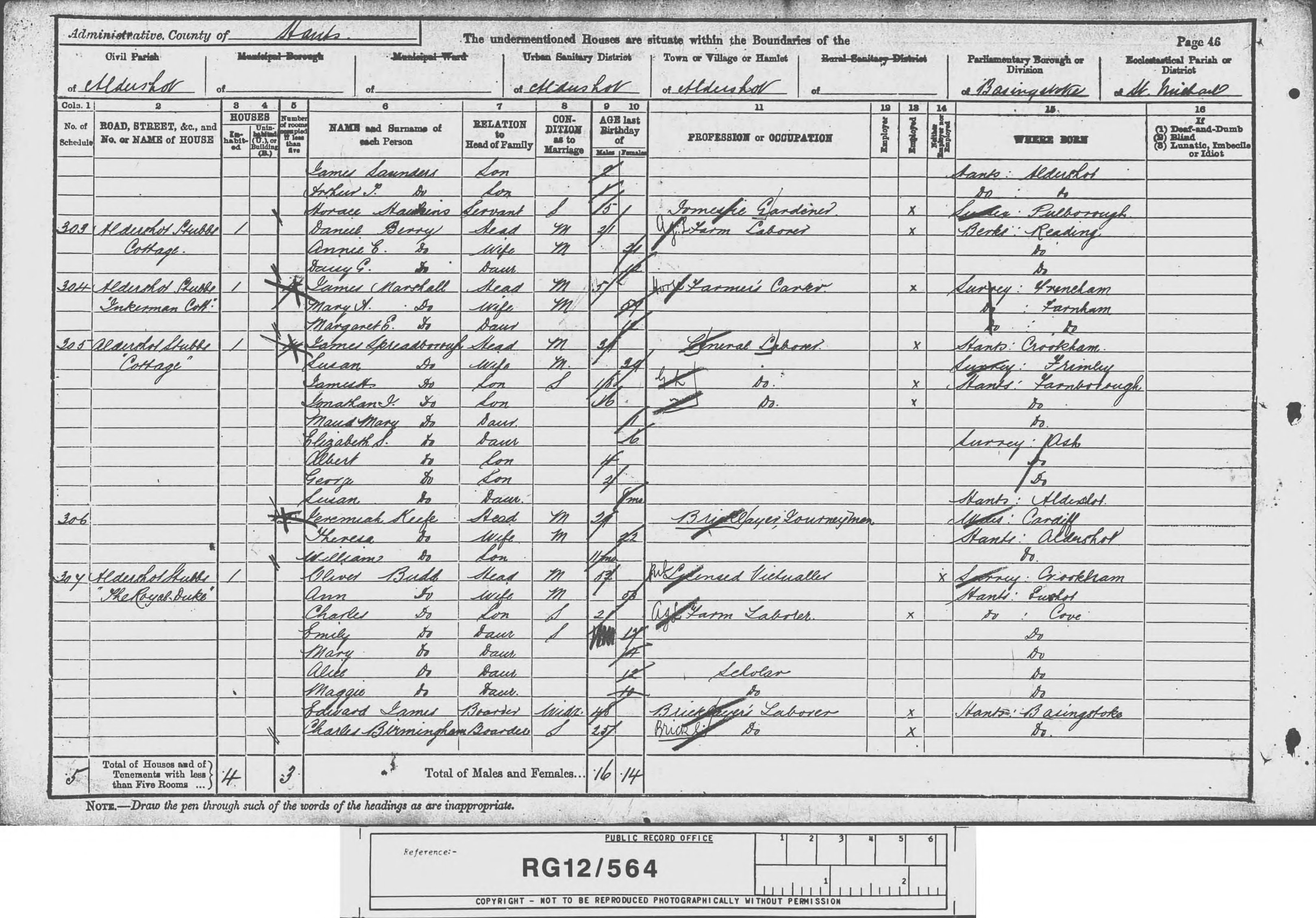 | Census 1891* | 5 April 1891 | James Spreadboroughappeared in the 1891 census at Cottage, Aldershot Stubbs, Aldershot, Farnham, Surrey, England.11 |