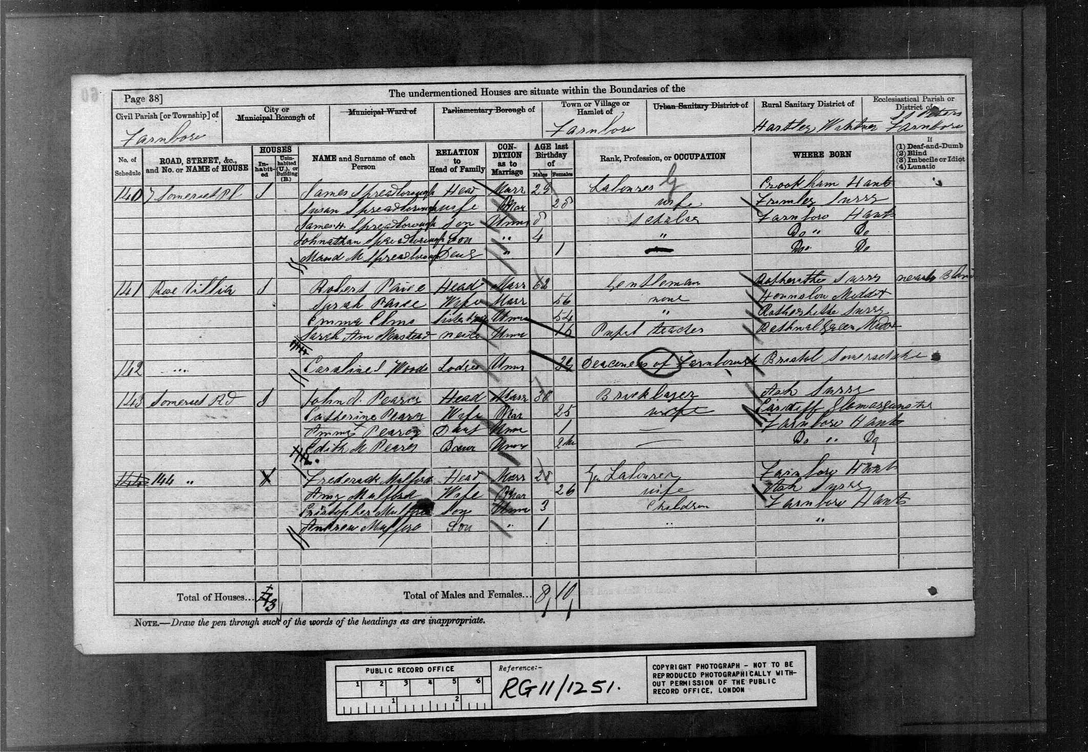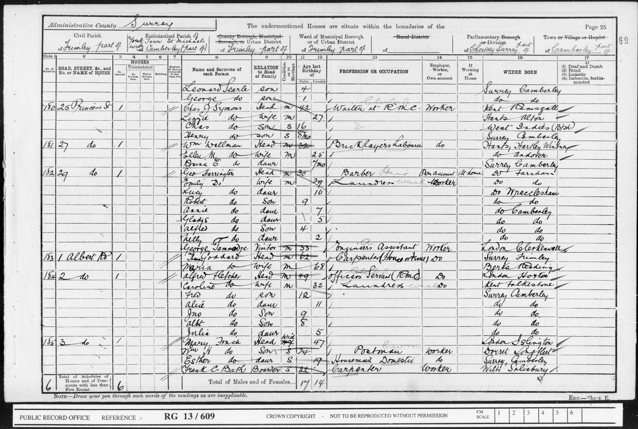 | Census 1881* | 3 April 1881 | James Spreadboroughappeared in the 1881 census at 7 Somerset Place, Farnborough, Hartley Wintney, Hampshire, England.8 |