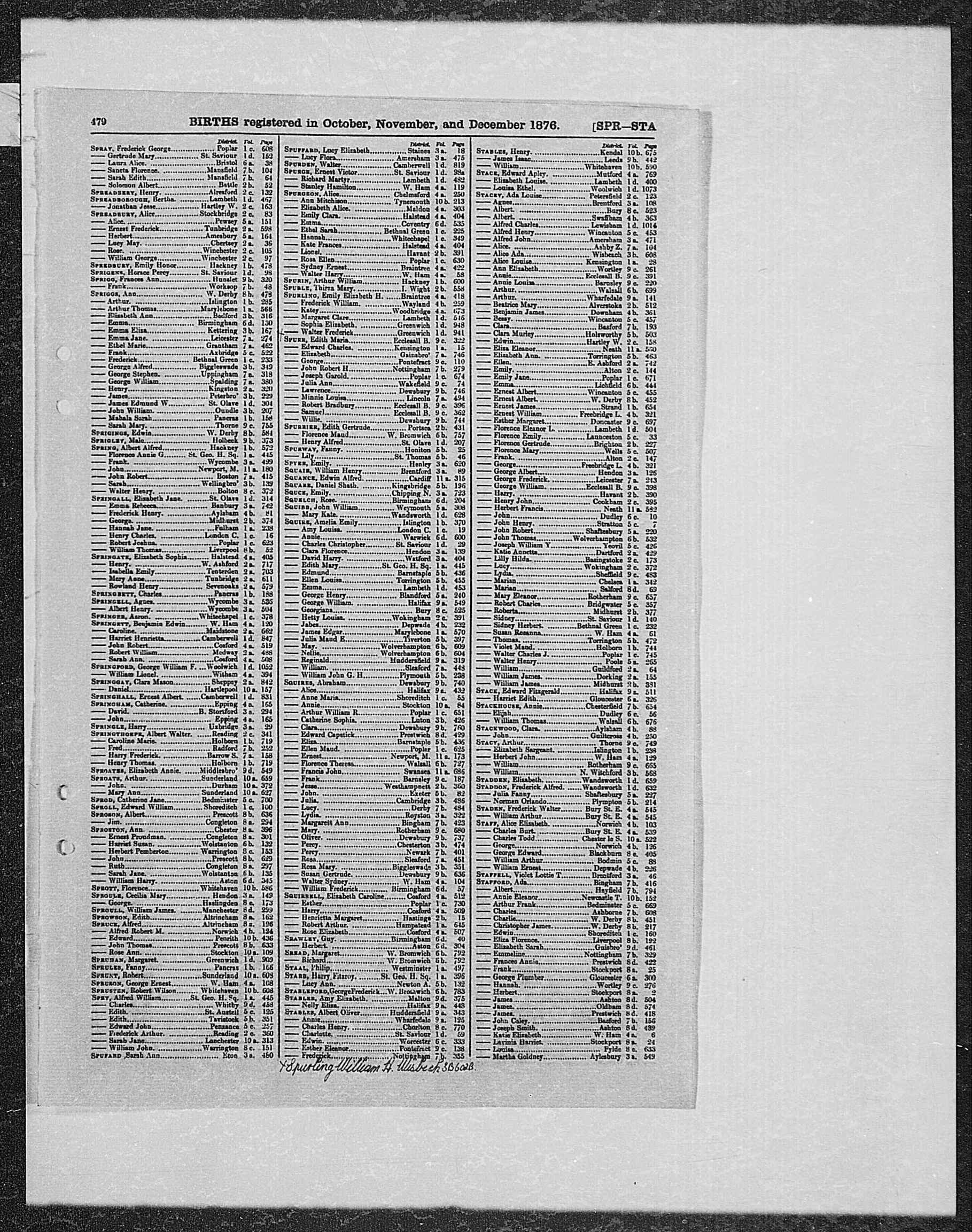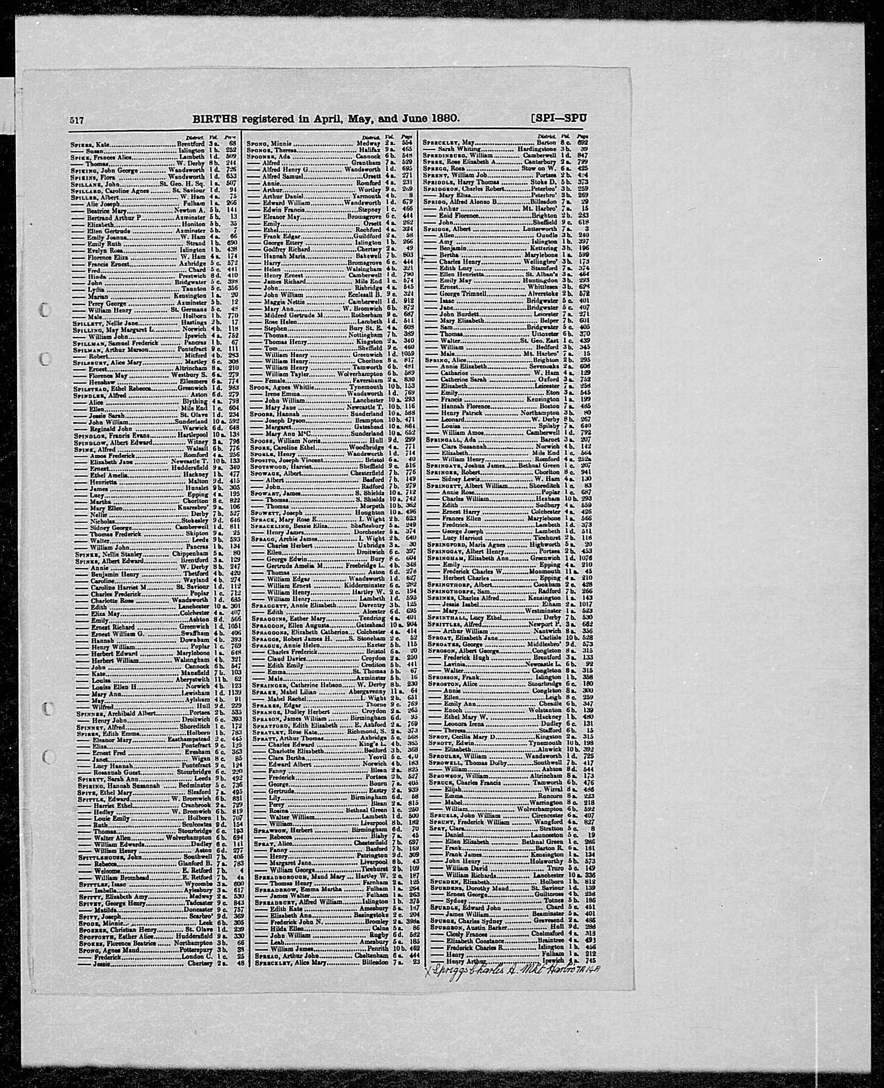 England & Wales births 1837-2006 Transcription First name(s) JAMES Last name SPREADBOROUGH Birth year 1873 Birth quarter 1 Registration month - Mother's last name Goddard [given by new style GRO Indexes] District Hartley Wintney County Hampshire Country England Volume 2C Page 178 Record set England & Wales Births 1837-2006 Category Birth, Marriage, Death & Parish Records Subcategory Civil Births Collections from Great Britain, England © Findmypast |