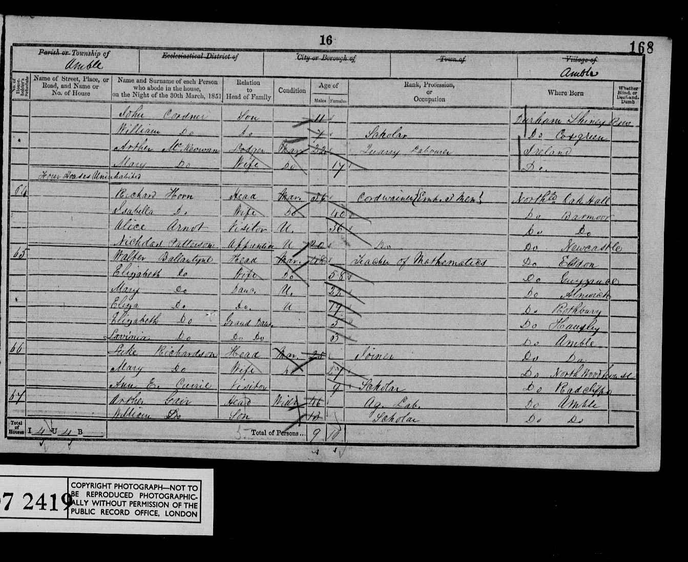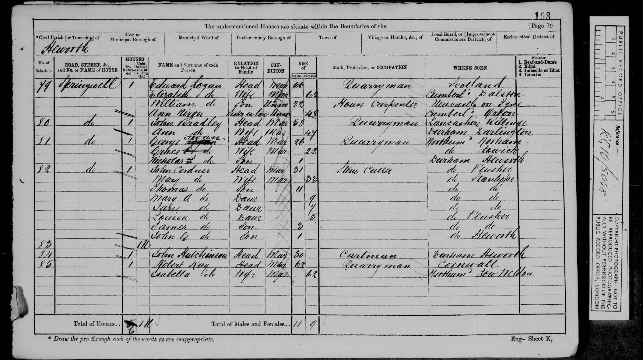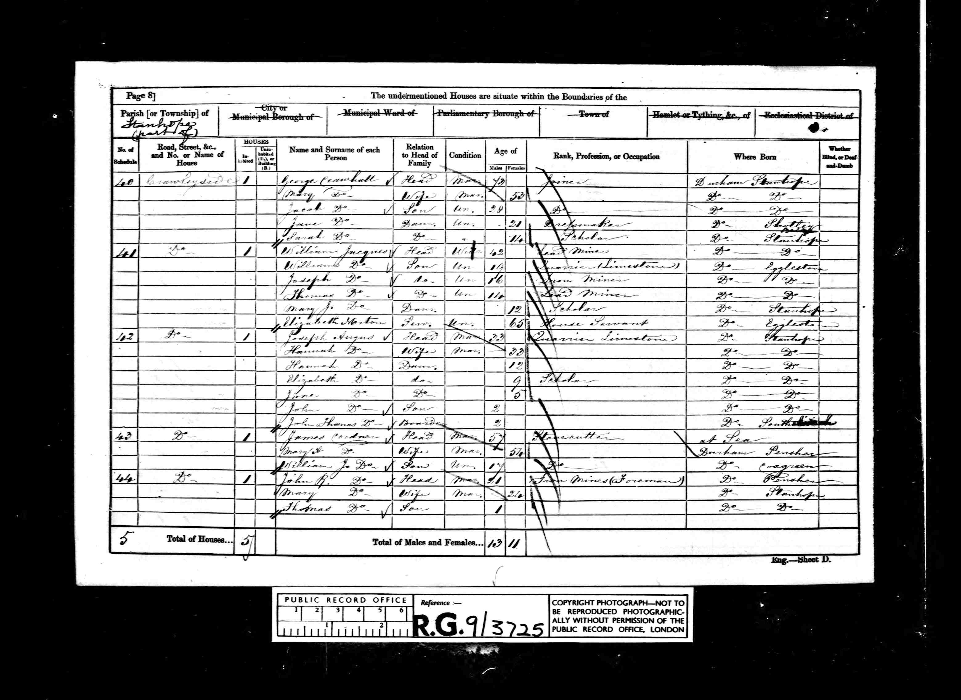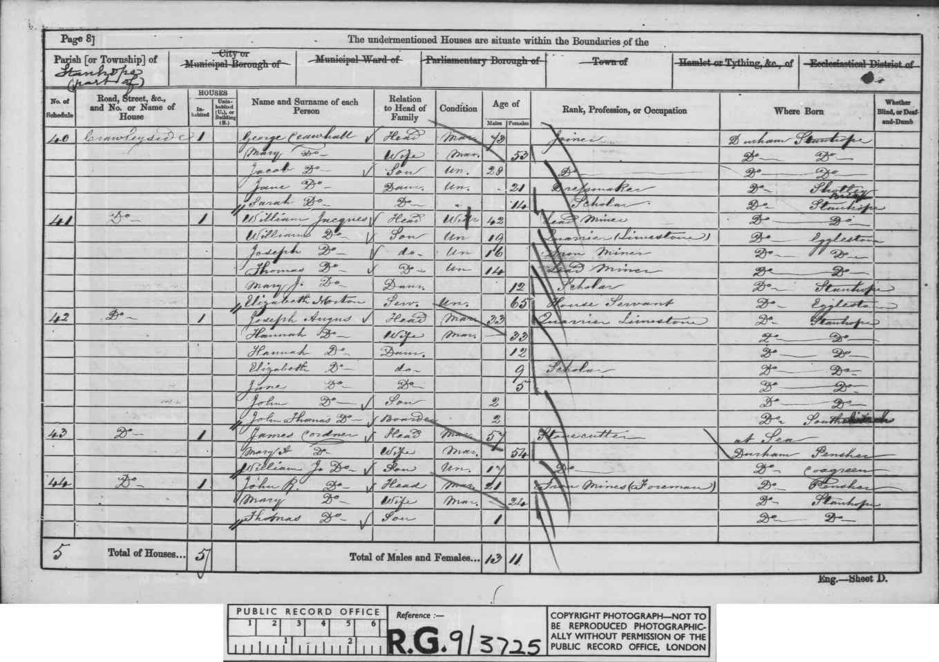 | (Witness) Census 1851 | 30 March 1851 | Ann Jackson appeared in the household of William Cordner in the 1851 census at Quarry Head, Penshaw, Co Durham, England. 177 Quarryhead William Cordner Head M 45 Quarryman D'ham B.Wearmouth Ann Wife M 39 D'ham Tanfield Jane Dau U 17 Dressmaker Penshaw Mary Dau U 13 Scholar at Home Penshaw Isabella Dau U 7 Scholar at Home Penshaw George James Son U 5 Scholar at Home Penshaw William Son U 2 Penshaw Hannah Dau U 2m Penshaw Eliza Maugham StepD U 10 Scholar at Home Durham James Jardine Lodger U 28 Sup of Draining Scotland George Gracewood Lodger U 23 Colliery C I Middx London James Steweart Lodger U 21 Colliery C I Ireland.10 1851 Penshaw HO 107 2393 1-201 Sched177 Quarryhead William Cordner Head Mar 45yrs Quarryman B.Wearmouth Ann Cordner Wife Mar 39yrs Tanfield Jane Cordner Dau Unm 17yrs Dressmaker Penshaw Mary Cordner Dau Unm 13yrs Scholar at home Penshaw Isabella Cordner Dau Unm 7yrs Scholar at home Penshaw George James Cordner Son Unm 5yrs Scholar at home Penshaw William Cordner Son Unm 2yrs Penshaw Hannah Cordner Dau 2mth Penshaw Eliza Maughan Step-dau 10yrs Durham James Jardine Lodger 28yrs Superintendent Scotland of draining George Gracewood Lodger 23yrs Colliery Clerk Middlesex James Hewitt Lodger 21yrs Colliery Clerk Ireland |