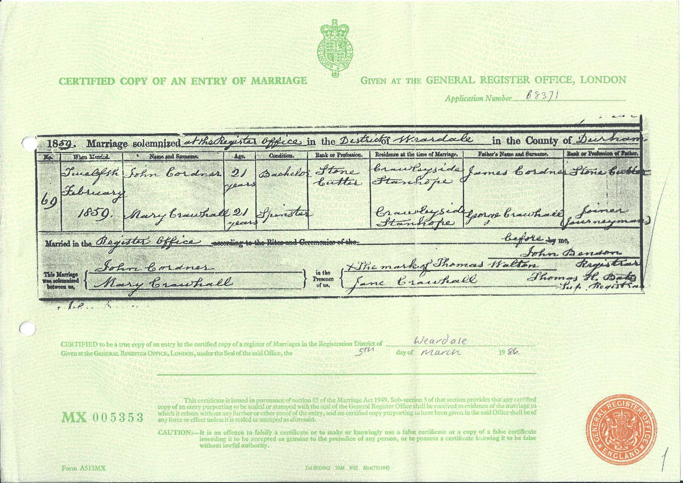 Richard Cordner of full age Batchelor Stonecutter Hylton