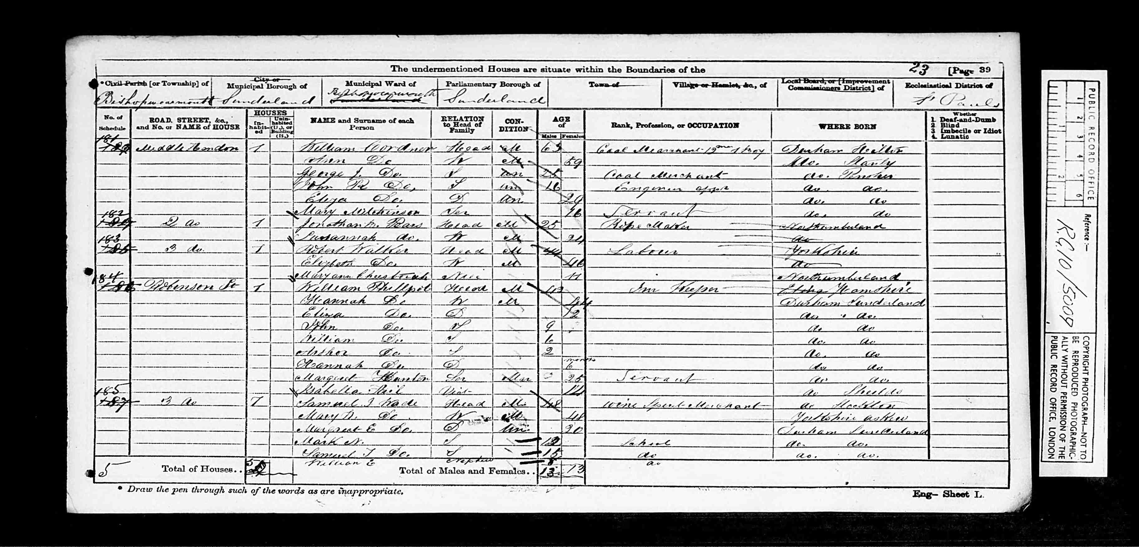 | (Witness) Census 1871 | 2 April 1871 | Eliza Maughan appeared in the household of William Cordner in the 1871 census at Middle Hendon, Bishopwearmouth, Sunderland, Co Durham, England.4 1871 Census Bishopwearmouth Sunderland Middle Hendon DRO M18/42 RG10/5009 page 23 William Cordner Head Marr 63 Coal Merchant Hylton DUR employing 12 men + 1 boy Ann Wife 59 Stanley DUR George J Son 25 Coal Merchant Pensher DUR John R Son 16 Engineman App Pensher DUR Eliza Dau 29 Unmarried Pensher DUR Mary Wilkinson 16 Servant Durham |