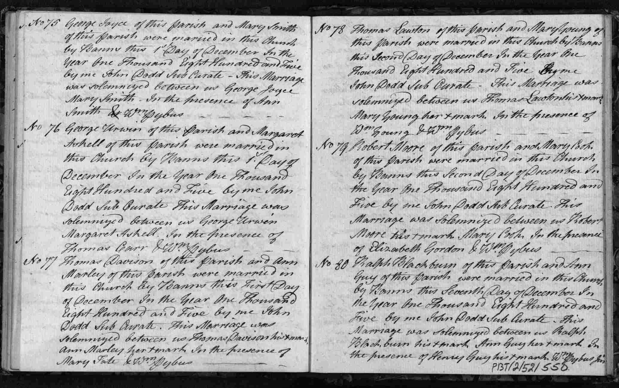 "England Marriages, 1538–1973 ," database, FamilySearch (https://familysearch.org/ark:/61903/1:1:NNVG-5ZS : 10 December 2014), Robert Moore and Mary Cook, 02 Dec 1805; citing Chester-Le-Street, Durham, England, reference page 54 no.79; FHL microfilm 1,894,224. - [S24] Pen Par Reg, Penshaw Marriages.