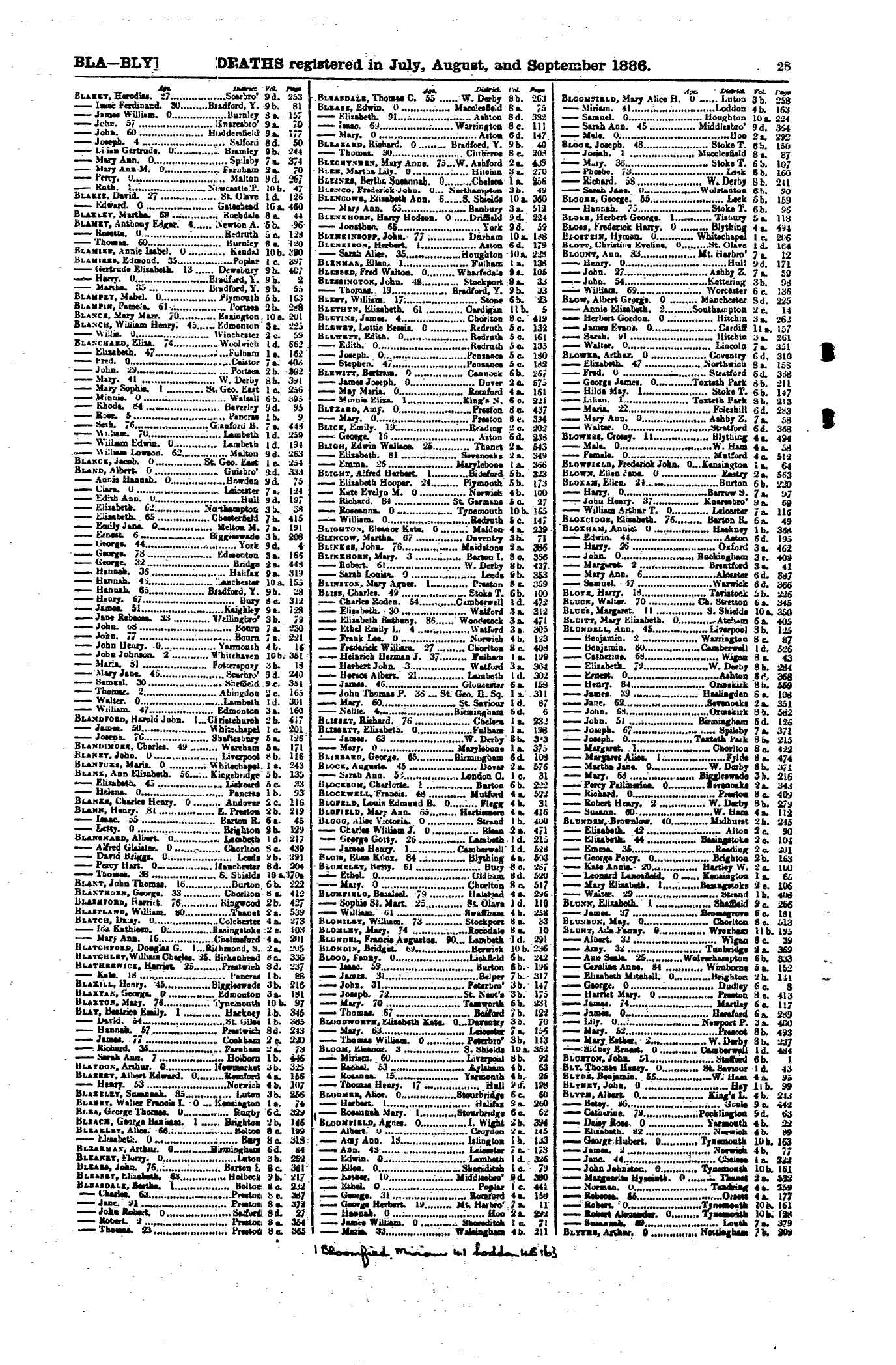 | Death* | 1926 | Elizabeth Ridley Pickering died in 1926 at Hexham, Northumberland, England; Ju Qu.3 England & Wales deaths 1837-2007 Transcription First name(s) ELIZABETH R Last name VEASEY Gender Female Birth day - Birth month - Birth year 1897 Age 29 Death quarter 2 Death year 1926 District HEXHAM County Northumberland Volume 10B Page 459 Country England Record set England & Wales deaths 1837-2007 Category Birth, Marriage, Death & Parish Records |