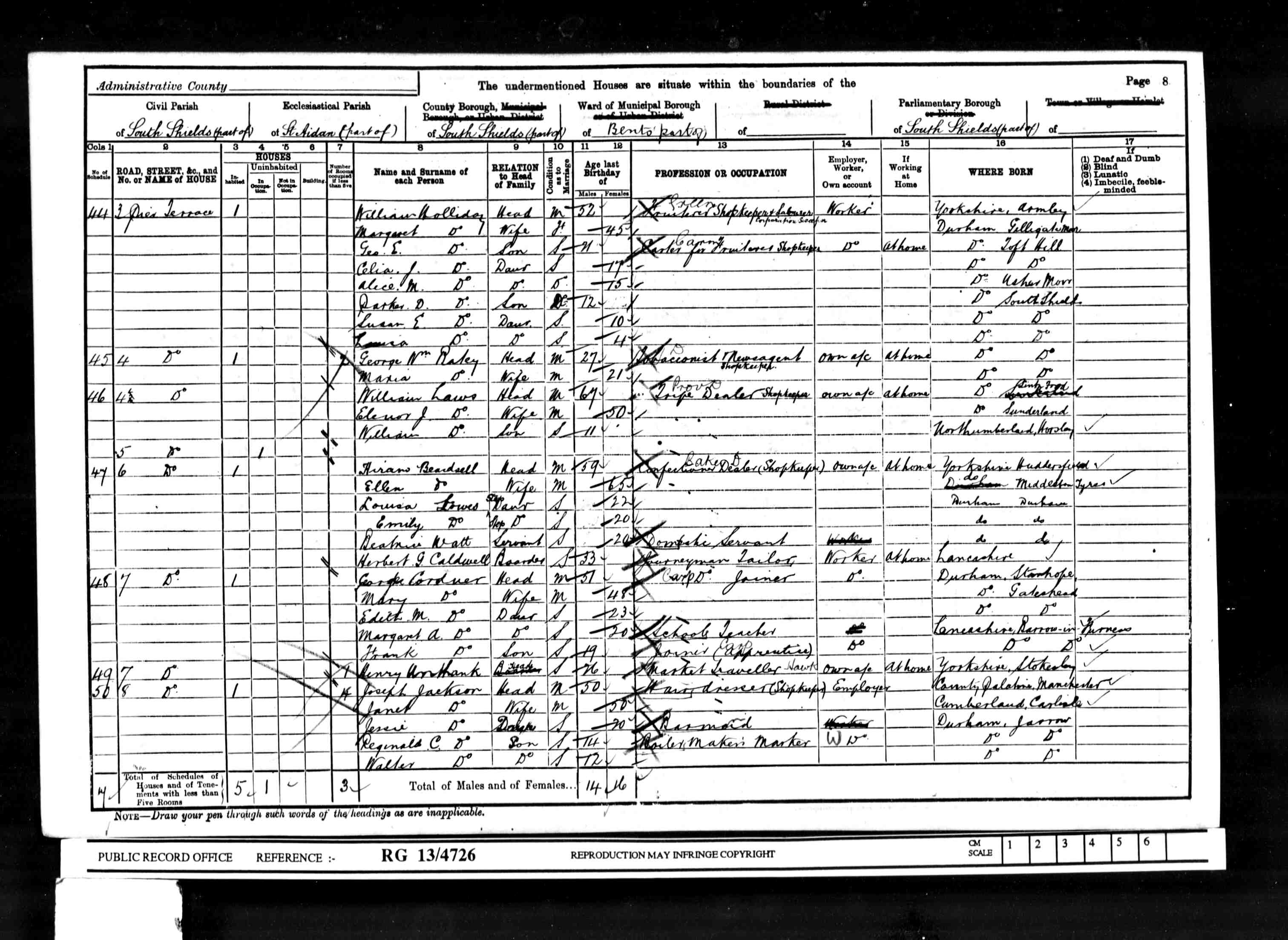 Country: England. - [S236] 1911 Census South Shields, 1911 census transcription details for: Dean Road Beaconsfield Terr South Shields