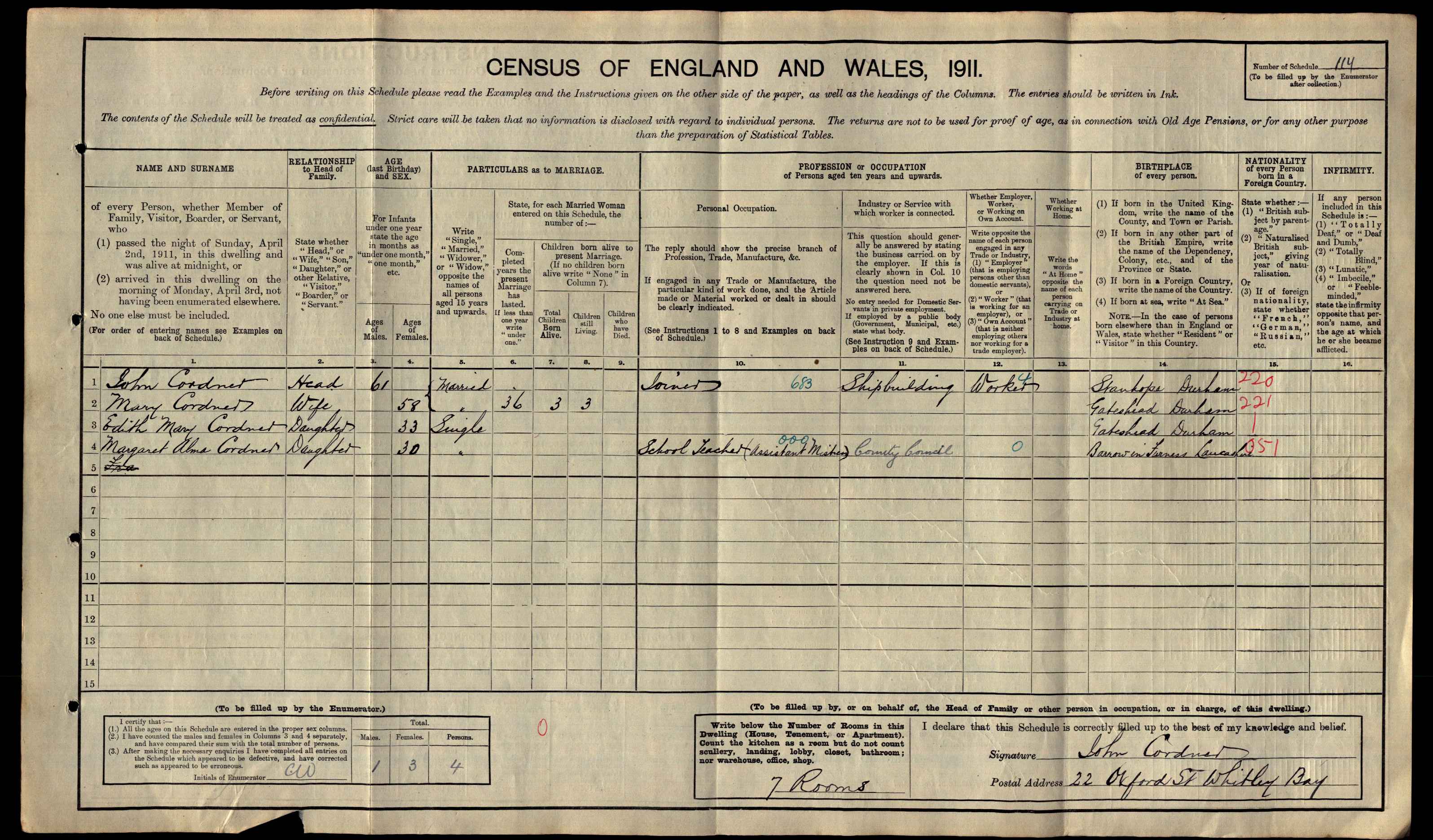 - [S476] 1911 Census Sunderland, 1911 England, Wales & Scotland Census Transcription