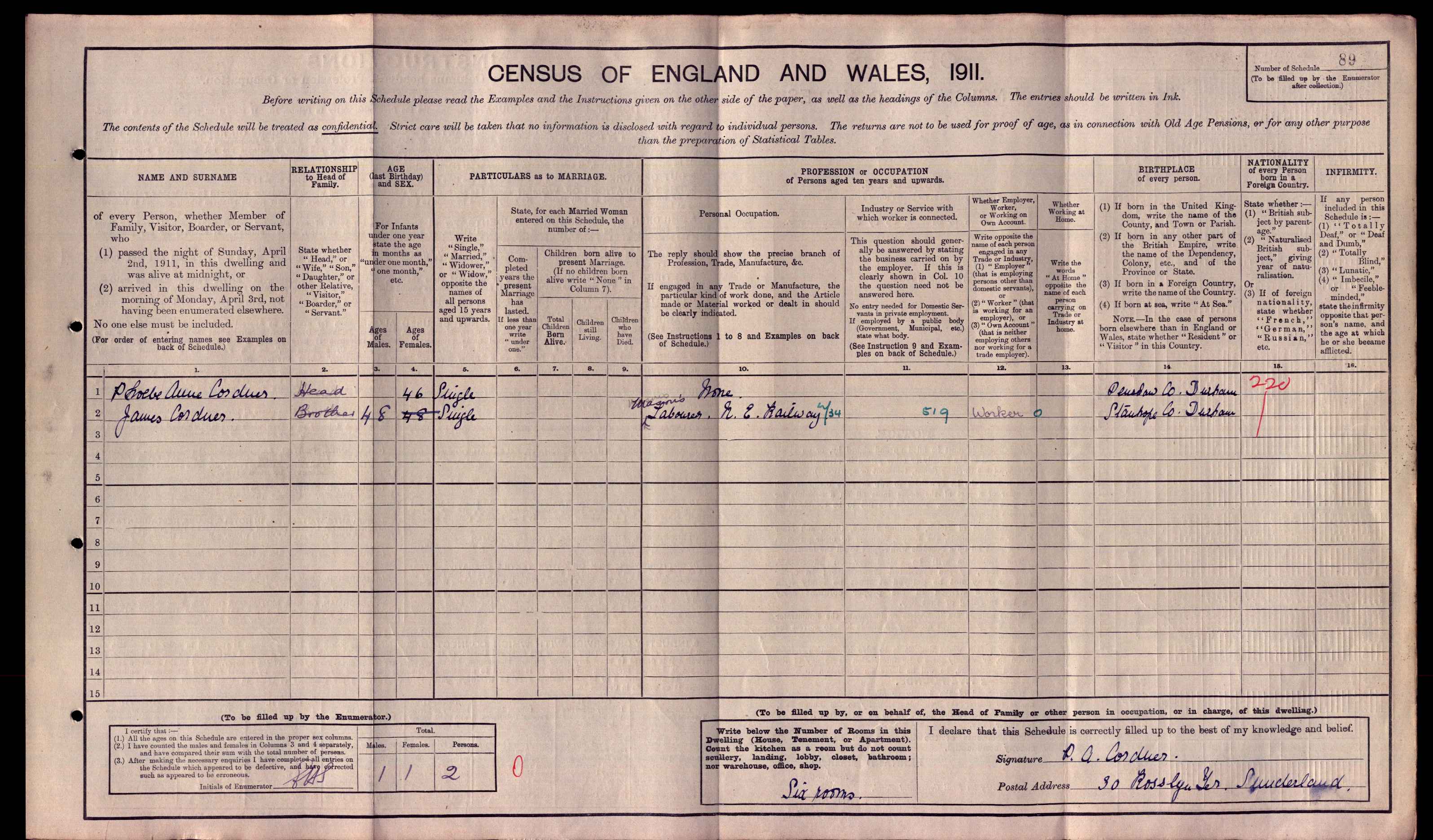 | Census 1911* | 2 April 1911 | Phoebe Ann Cordner appeared on the census of 2 April 1911 at 30 Rosslyn Terrace, Sunderland, Co Durham, England.9 |