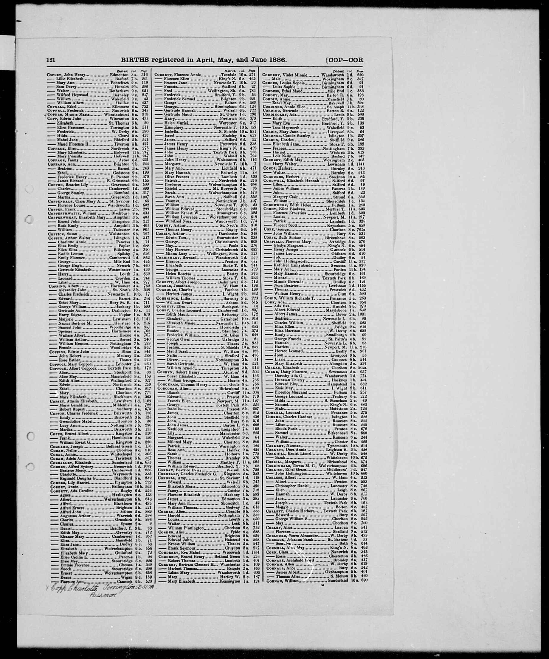 Record Transcription: England & Wales Births 1837-2006 First name(s) Jane Isabella Last name Wailes Birth year 1881 Birth quarter 1 Registration month - Mother's maiden name Cordner District Tynemouth County Northumberland Country England Volume 10B Page 151 Record set England & Wales Births 1837-2006 Category Birth, Marriage, Death & Parish Records Subcategory Civil Births Collections from Great Britain, England © brightsolid online publishing ltd - [S673] St Peter, Wallsend, Northumberland, "England Births and Christenings, 1538-1975", database, FamilySearch