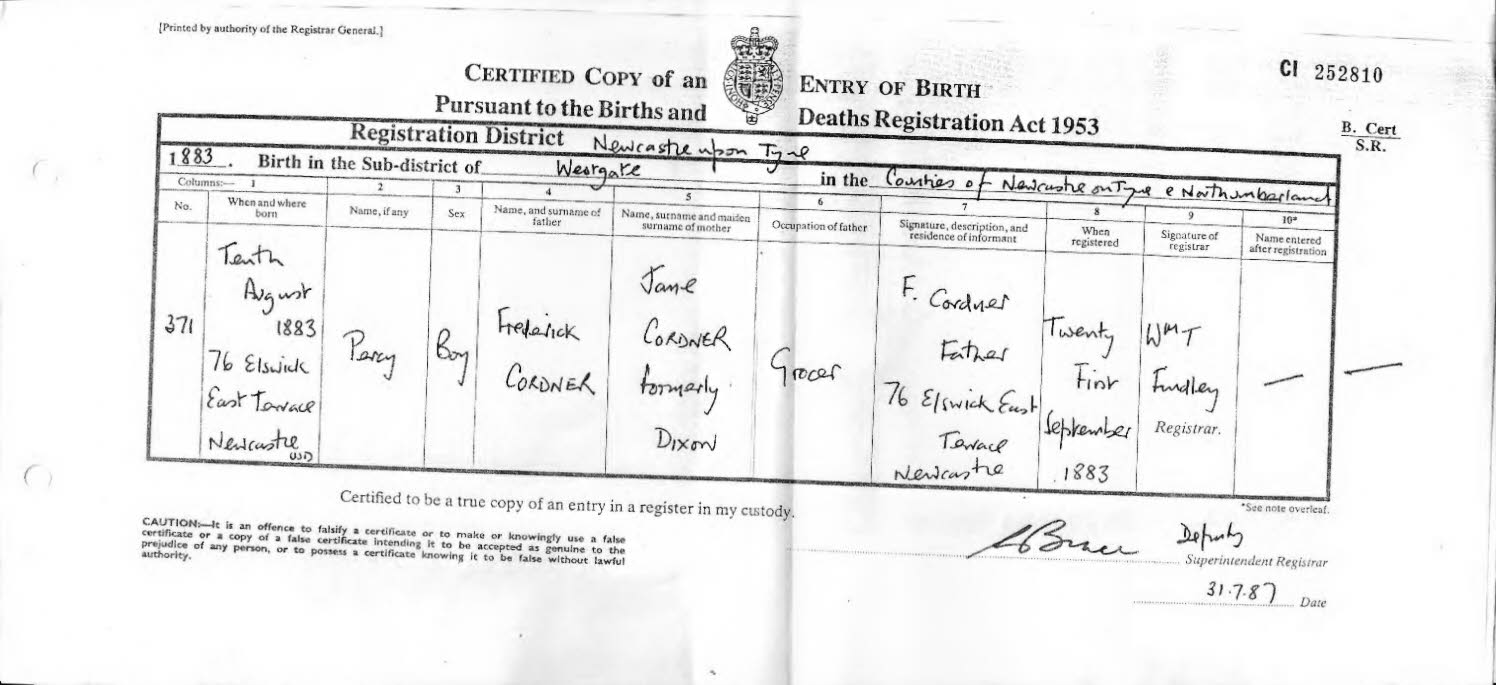 | Note* | George William Cordner Letter from Roi Cordner 9/7/1981 "George William my father boastfully was a very great man, very well educated at Newcastle Grammar School". . | |