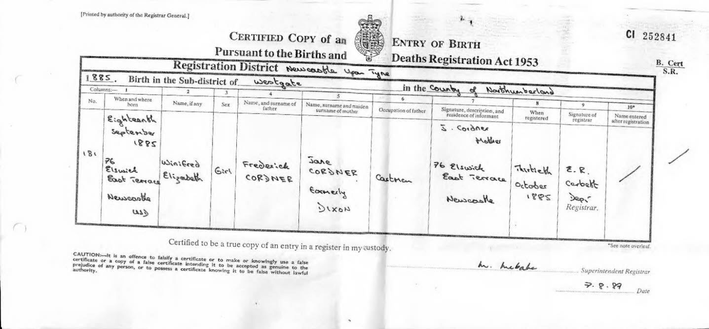 "England Births and Christenings, 1538-1975," database, FamilySearch (https://familysearch.org/ark:/61903/1:1:N1NZ-X32 : accessed 20 July 2015), Mary Nora Cordner, 29 Apr 1891; citing Elswick, Northumberland, England, reference item 11 p 88; FHL microfilm 2,193,276. - [S88] GRO Newcastle Tyne.