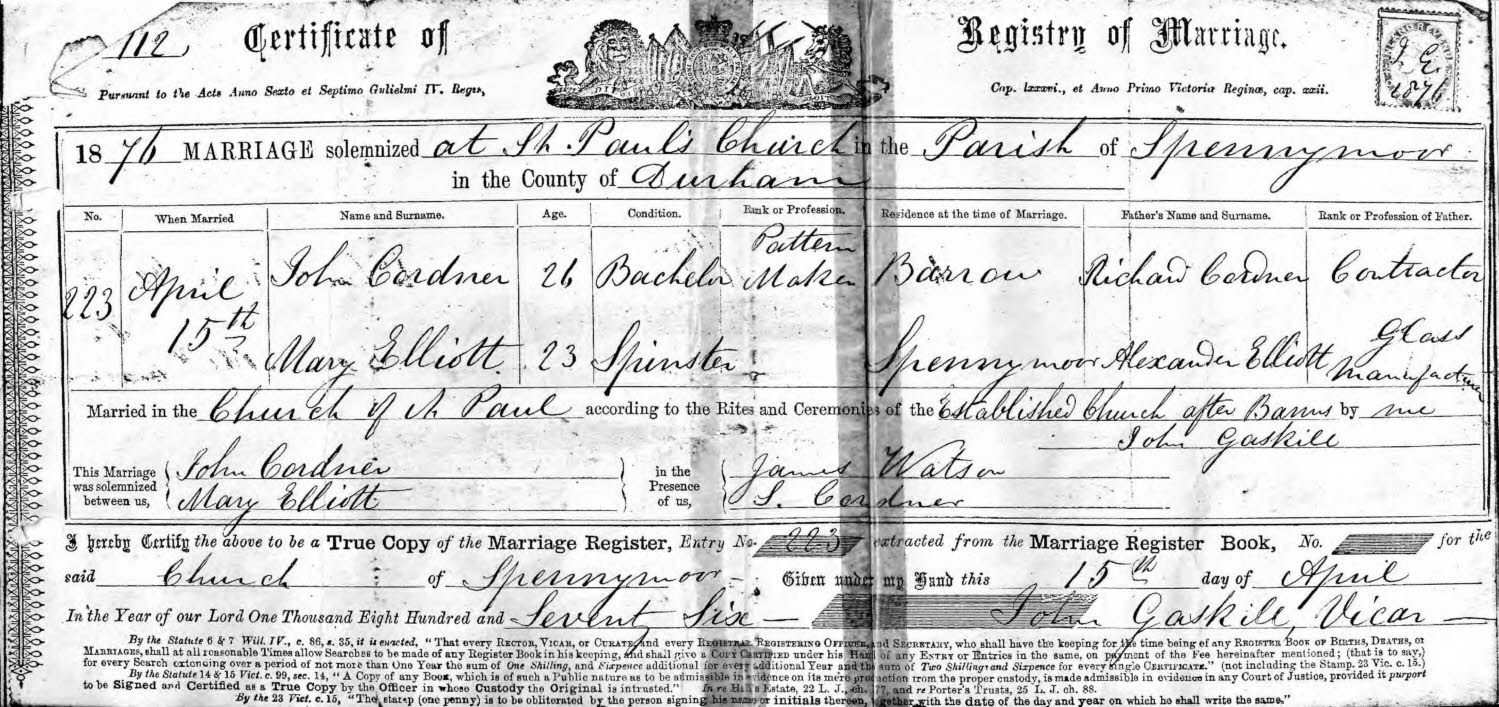 | Marriage* | 17 March 1891 | Thomas Hodgson Cordner married Ellen Smart on 17 March 1891 at Newcastle Tyne (GRO 10b/225). |