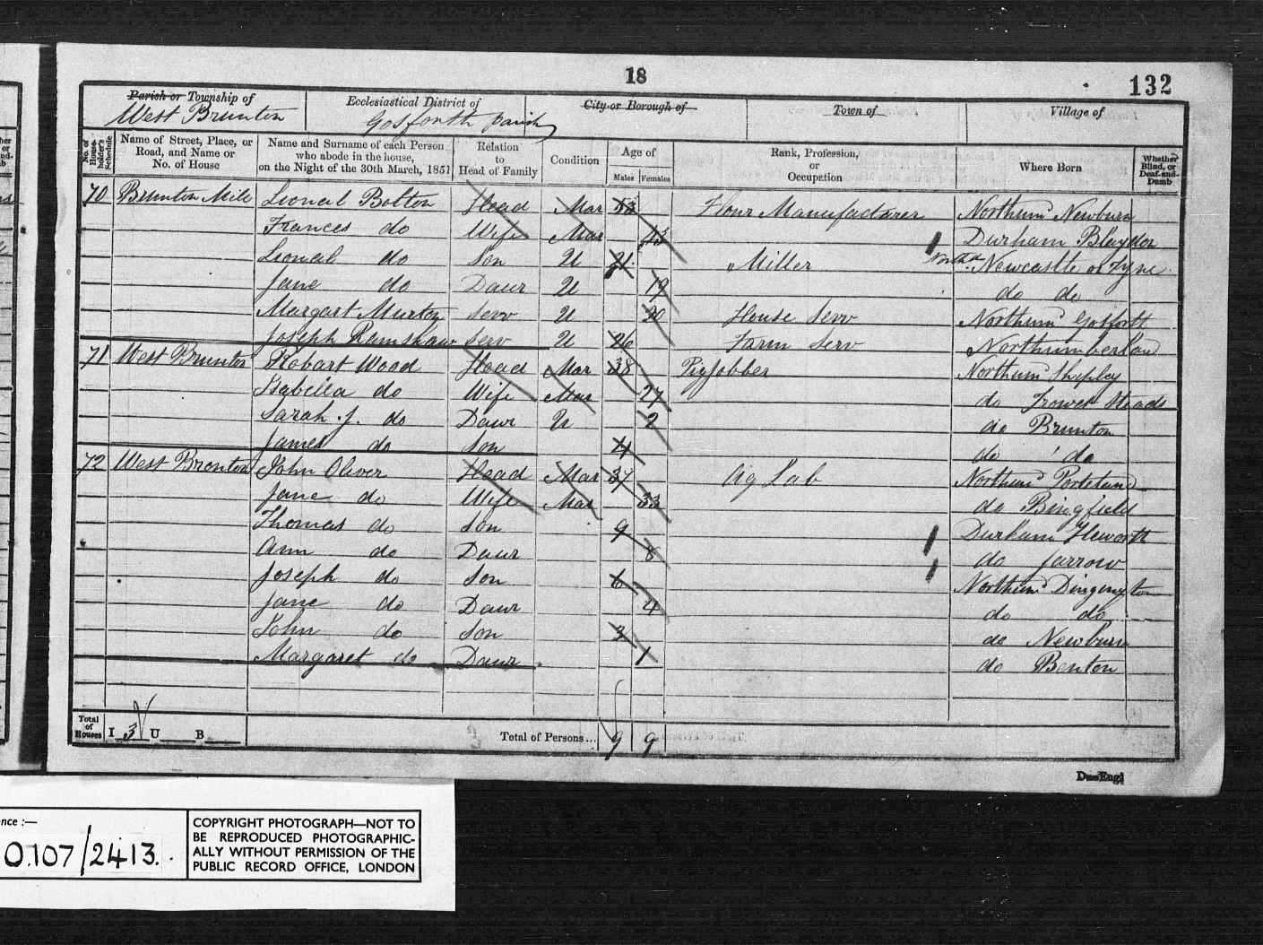 | (Witness) Census 1851 | 30 March 1851 | She appeared in the household of William Murton in the 1851 census at Fold No 1, Seghill, Northumberland, England.2 1851 Census Seghill No 69 Fold No1 William Murton Head Married 28M Coal Miner born North'd Gosforth Elizabeth Murton Wife Married 22F North'd Long Benton Mary A Murton Daughter 2F North'd Seghill Ralph Murton Son 2mthsM North'd Seghill |