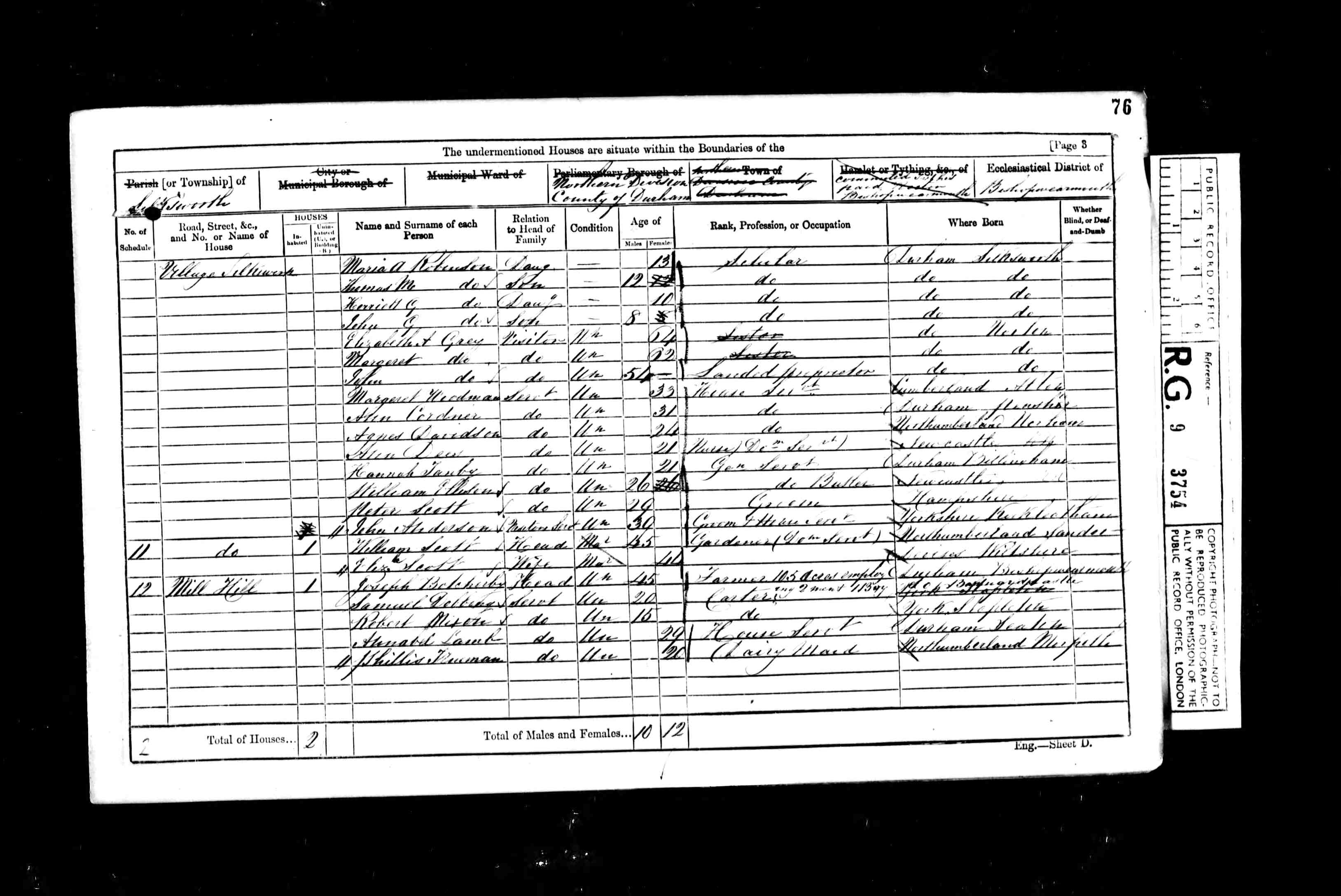 | (Witness) Census 1851 | 30 March 1851 | He appeared in the household of Frederick Fenwick in the 1851 census at Stanhope, Co Durham, England.4 |