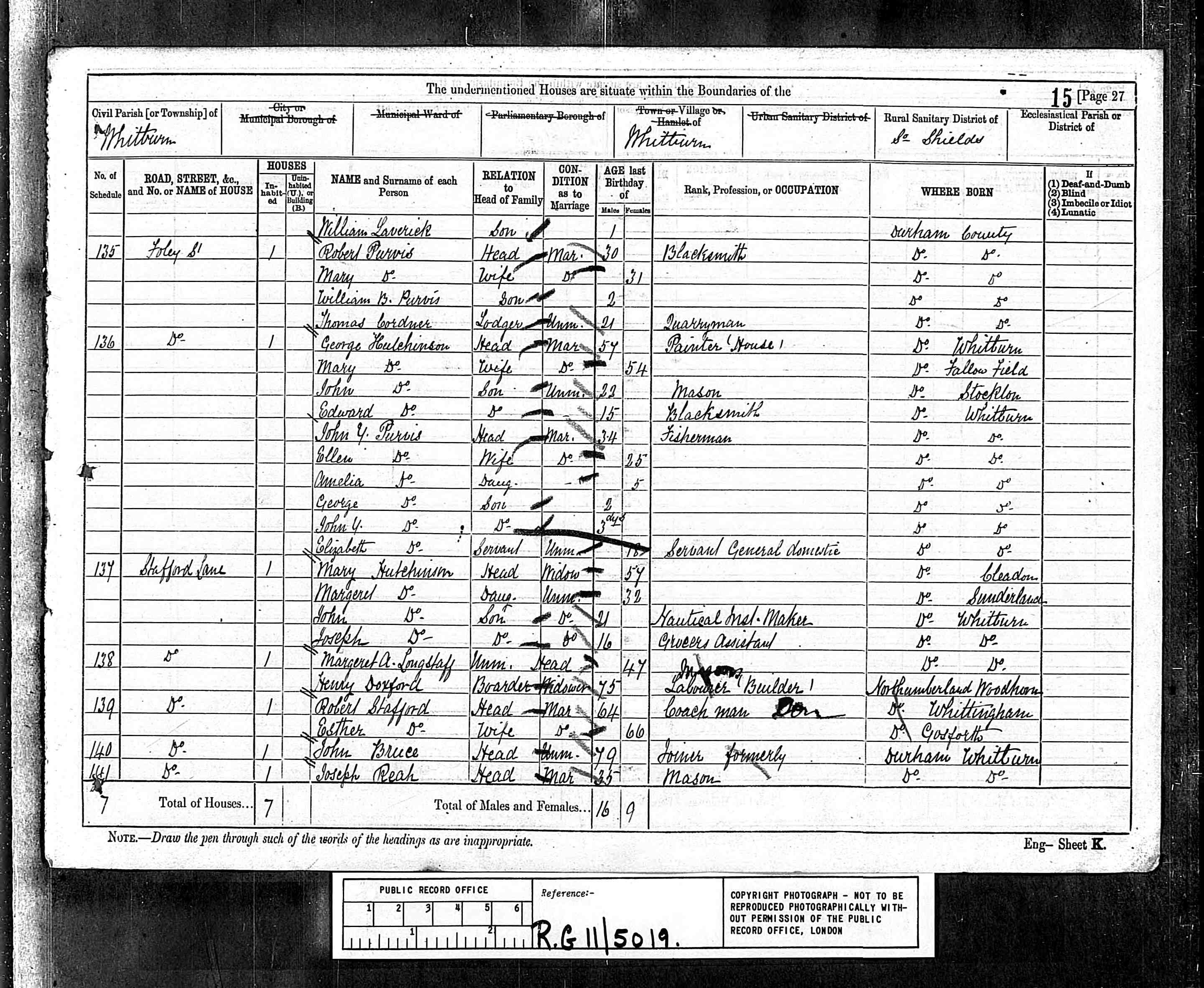 | (Witness) Census 1881 | 3 April 1881 | Mary Sarah Crawhall appeared in the household of John Robinson Cordner in the 1881 census at Hunters Terrace, Usworth, Co Durham, England.9 Dwelling: Hunters Terrace Census Place: Usworth, Durham, England Source: FHL Film 1342199 PRO Ref RG11 Piece 4984 Folio 96 Page 66 Marr Age Sex Birthplace John R. CORDNER M 40 M Pensher, Durham, England Rel: Head Occ: Contractor (ND) Mary CORDNER M 42 F Stanhope, Durham, England Rel: Wife Louisa CORDNER U 15 F Pensher, Durham, England Rel: Daur Occ: Domestic Assistant At Home William J. CORDNER 13 M Pensher, Durham, England Rel: Son Occ: Scholar John G. CORDNER 10 M Usworth, Durham, England Rel: Son Occ: Scholar Phillis CORDNER 9 F Usworth, Durham, England Rel: Daur Occ: Scholar Sarah CORDNER 6 F Pensher, Durham, England Rel: Daur Occ: Scholar Alfred CORDNER 2 m M Usworth, Durham, England Rel: Son |