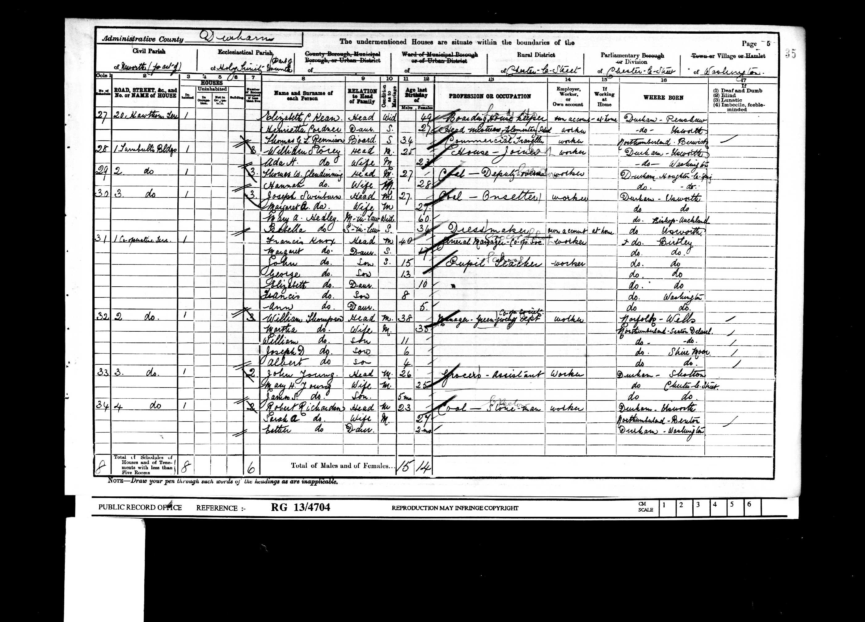 | (Witness) Census 1901 | 31 March 1901 | Mary Sarah Crawhall appeared in the household of John Robinson Cordner in the 1901 census at 62 Ridley Street, Heworth, Gateshead, Co Durham Co Durham, England. Phillis appears on this census as a son Philip although all evidence points to this being Phillis.11 1901 census transcription details for: 62, Ridley Street, Heworth, Felling National Archive Reference: RG number: RG13 Piece: 4749 Folio: 110 Page: 52 Reg. District: Gateshead Sub District: Heworth Parish: Heworth Enum. District: 17 Ecclesiastical District: St Marys City/Municipal Borough: Address: 62, Ridley Street, Heworth, Felling County: Durham Name Relation Condition Sex Age BirthYear Occupation ,Disability Where Born CORDNER, John Head Married M 60 1841 Stone Quarry Man Penshaw Durham CORDNER, Mary Wife Married F 63 1838 Stanhope Durham CORDNER, John Son Single M 30 1871 General Labourer Heworth Durham CORDNER, Philip Son Single M 28 1873 Heworth Durham CORDNER, Sarah Daughter Single F 26 1875 Penshaw Durham RG number: RG13 Piece: 4749 Folio: 110 Page: 52 Registration District: Gateshead Sub District: Heworth Enumeration District: 17 Ecclesiastical Parish: St Marys Civil Parish: Heworth Municipal Borough: Address: 62, Ridley Street, Heworth, Felling County: Durham © findmypast.co.uk |