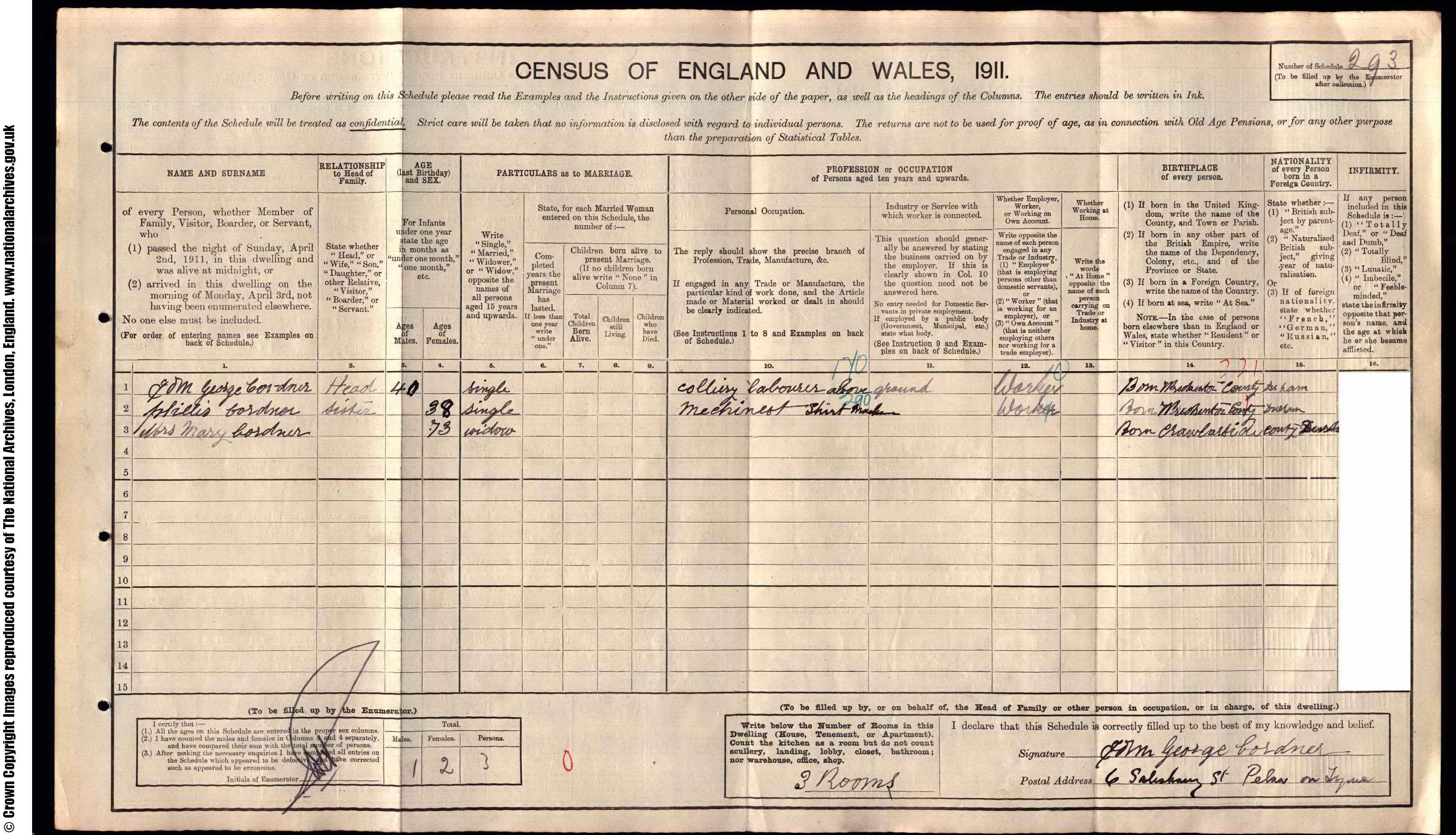 | (Witness) Census 1911 | 2 April 1911 | Mary Sarah Crawhall appeared on the census of 2 April 1911 in the household of John George Cordner at 6 Salisbury Street, Pelaw on Tyne, Co Durham, England; Census gives name as Tom George but felt to be John George.12 |