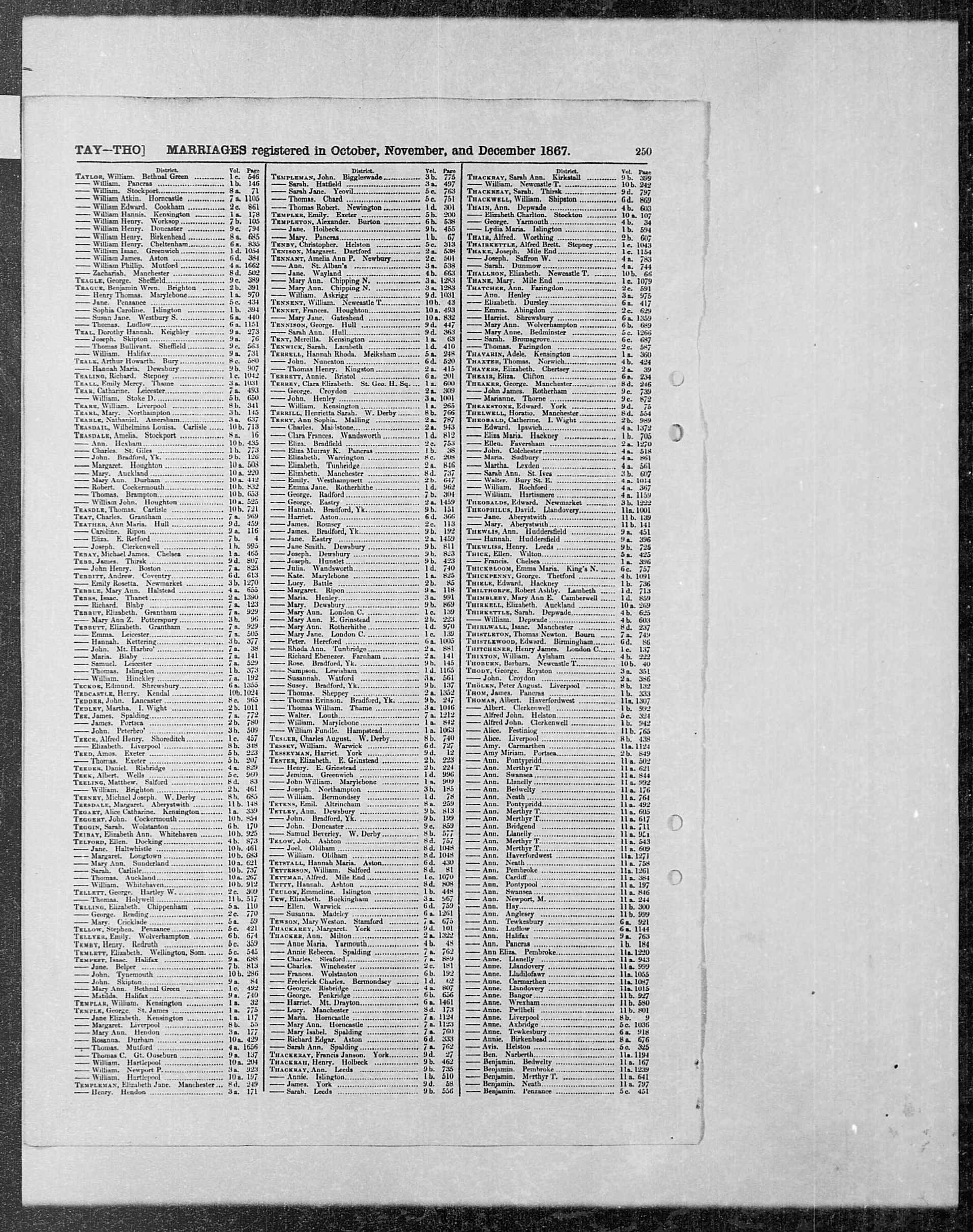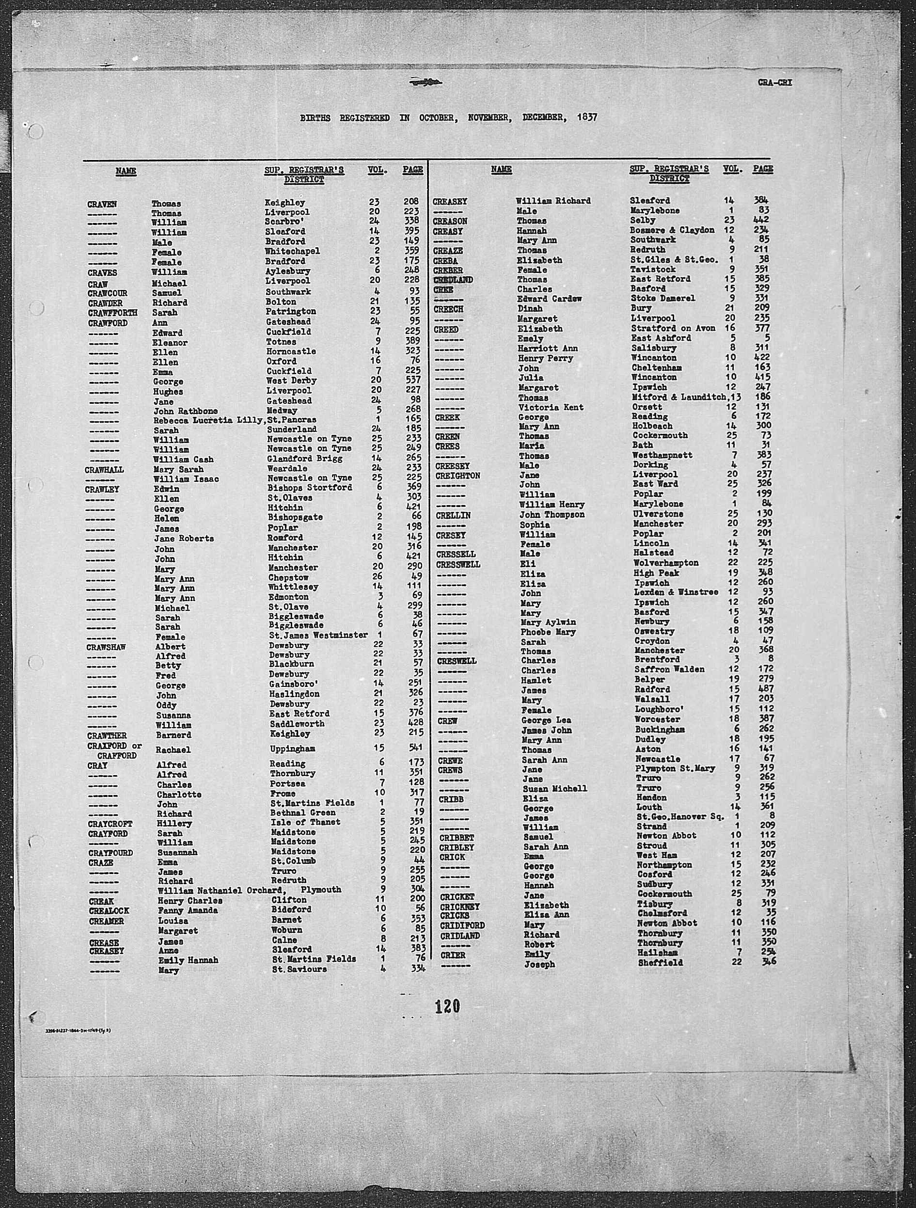 Record Transcription: England & Wales Births 1837-2006 First name(s) Mary Sarah Last name Crawhall Birth quarter 4 Birth year 1837 Mother's maiden name - District Weardale County Durham Country England Volume 24 Page 233 Record set England & Wales Births 1837-2006 Category Birth, Marriage, Death & Parish Records Subcategory Civil Births Collections from Great Britain, England © brightsolid online publishing ltd - [S111] GRO Weardale, Gro Weardale Marriage Certificate