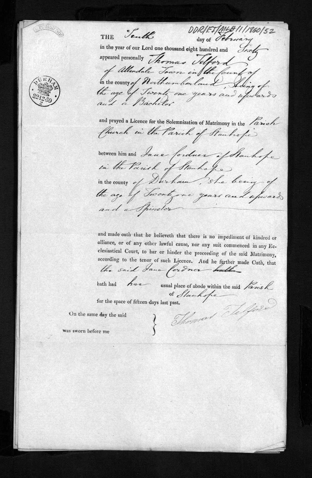 | (Witness) Baptism | 15 July 1860 | She witnessed the baptism of Thomas Cordner on 15 July 1860 at Crawleyside, Stanhope, Co Durham, England; Stanhope EP/St 1/15 D'ham RO Thomas son of John Cordner and wife Mary of Crawleyside a stonecutter . GRO Chester-le-St 10a/603:no proof .6 |