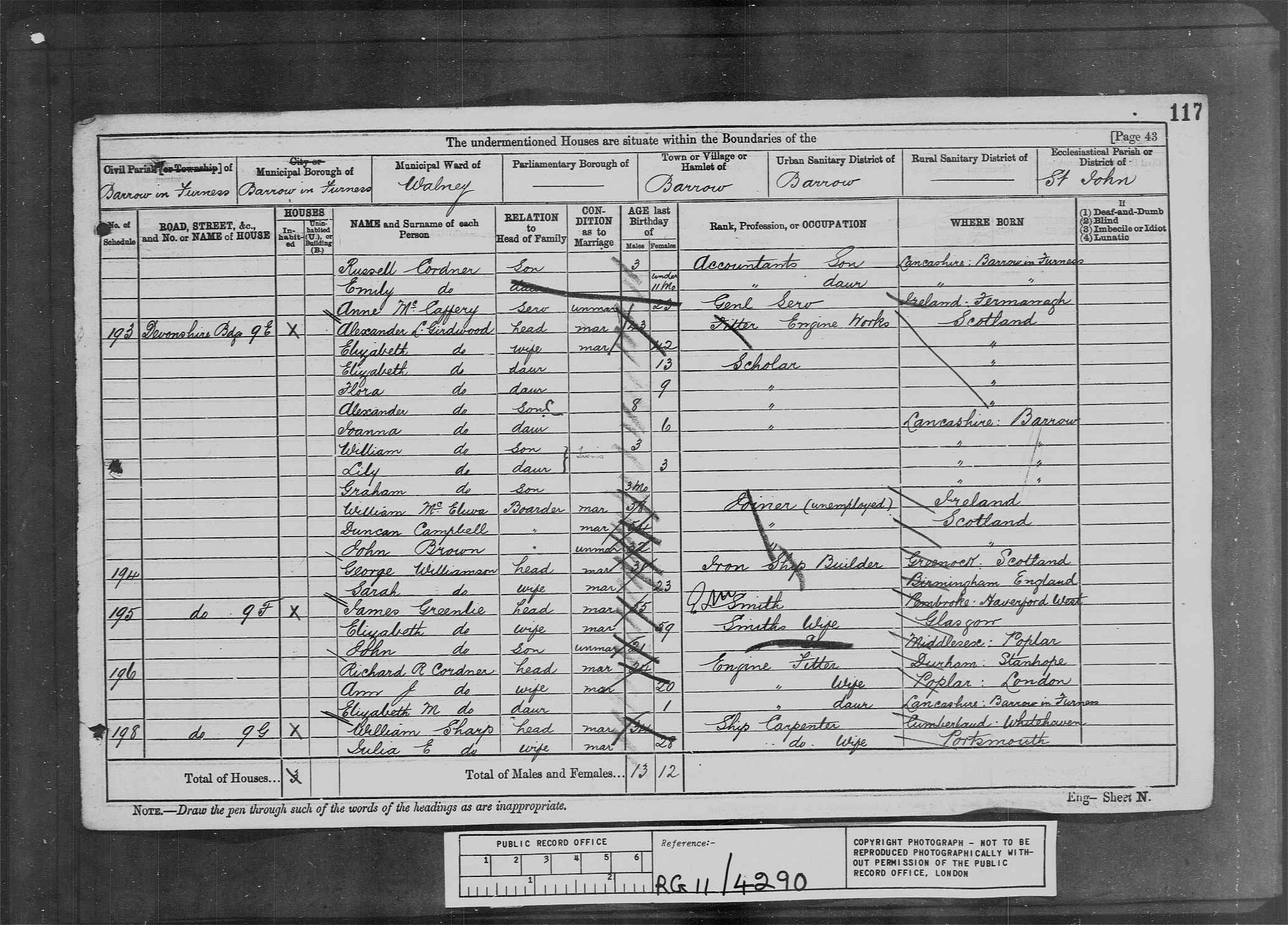 | (Witness) Census 1881 | 3 April 1881 | He appeared in the household of William James Cordner in the 1881 census at Devonshire Buildings, Barrow in Furness, Lancashire, England.1 |