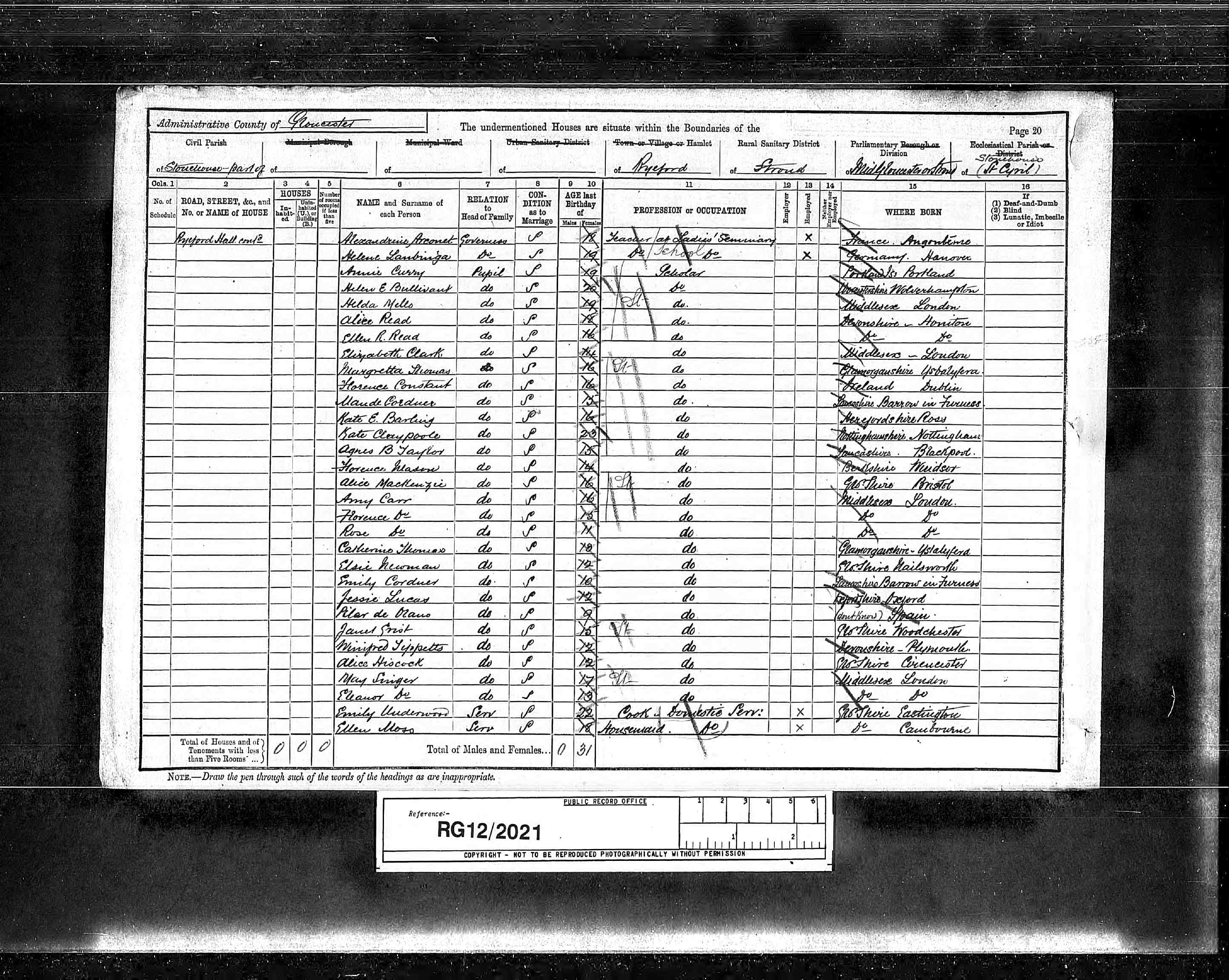 | (Witness) Census 1891 | 5 April 1891 | She appeared in the household of Emily Cordner in the 1891 census at Ryeford Hall Seminary, Ryeford, Stroud, Gloucestershire, England.5 1891 census - household transcription Person: CORDNER, Emily Address: Ryeford Hall, Noahs Ark, Stonehouse KIMMINS, Elizabeth C Head Widow F 68 1823 Proprietor Of Private School Chatham Kent VIEW KIMMINS, Frances E Daughter Single F 43 1848 Proprietor Of Private School Chatham Kent VIEW KIMMINS, Elizabeth S Daughter Single F 40 1851 Teacher At Ladies Seminary Isleworth Middlesex VIEW KIMMINS, Grace M Daughter Single F 28 1863 Teacher At Ladies Seminary Ebley Gloucestershire VIEW KIMMINS, Winifred E G Daughter Single F 22 1869 Teacher At Ladies Seminary Stonehouse Gloucestershire VIEW BRIGHTMAN, Clara Governess Single F 23 1868 Teacher At Ladies Seminary St Neots Huntingdonshire VIEW ARCONET, Alexandria Governess Single F 16 1875 Teacher Of Ladies Seminary France Angonteme VIEW LANBINGA, Helen Governess Single F 19 1872 Teacher Of Ladies Seminary Hanover Germany VIEW CURRY, Annie Pupil Single F 19 1872 Scholar Portland VIEW BULLIVANT, Helen E Pupil Single F 20 1871 Scholar Wolverhampton Worcestershire VIEW MELLS, Helda Pupil Single F 19 1872 Scholar London Middlesex VIEW READ, Alice Pupil Single F 18 1873 Scholar Honiton Devonshire VIEW READ, Ellen R Pupil Single F 16 1875 Scholar Honiton Devonshire VIEW CLARK, Elizabeth Pupil Single F 14 1877 Scholar London Middlesex VIEW THOMAS, Margretta Pupil Single F 16 1875 Scholar Glamorganshire Ysbalyford VIEW CONSTANT, Florence Pupil Single F 16 1875 Scholar Dublin Ireland VIEW CORDNER, Maude Pupil Single F 15 1876 Scholar Barrow in Furness Lancashire VIEW BARLING, Kate E Pupil Single F 16 1875 Scholar Ross Herefordshire VIEW CLAYPOOLE, Kate Pupil Single F 23 1868 Scholar Nottingham Nottinghamshire VIEW TAYLOR, Agnes B Pupil Single F 15 1876 Scholar Blackpool Lancashire VIEW MASON, Florence Pupil Single F 14 1877 Scholar Windsor Berkshire VIEW MACKENZIE, Alice Pupil Single F 16 1875 Scholar Bristol Gloucestershire VIEW CARR, Amy Pupil Single F 16 1875 Scholar London Middlesex VIEW CARR, Florence Pupil Single F 15 1876 Scholar London Middlesex VIEW CARR, Rose Pupil Single F 11 1880 Scholar London Middlesex VIEW THOMAS, Catherine Pupil Single F 13 1878 Scholar Ystalyfera Glamorganshire VIEW NEWMAN, Elsie Pupil Single F 12 1879 Scholar Nailsworth Glamorganshire VIEW CORDNER, Emily Pupil Single F 10 1881 Scholar Barrow in Furness Lancashire VIEW LUCAS, Jessie Pupil Single F 9 1882 Scholar Barrow in Furness Lancashire VIEW DE ?, Pilar Pupil Single F 9 1882 Scholar Spain VIEW GRIST, Janet Boarder Single F 15 1876 Scholar Woodchester Gloucestershire VIEW SIPPETTS, Winfred Boarder Single F 12 1879 Scholar Plymouth Devonshire VIEW HISCOCK, Alice Boarder Single F 12 1879 Scholar Cirencester Gloucestershire VIEW SINGER, Mary Boarder Single F 17 1874 Scholar London Middlesex VIEW SINGER, Eleanor Boarder Single F 13 1878 Scholar London Middlesex VIEW UNDERWOOD, Emily Servant Single F 22 1869 Cook Domestic Servant Eastington Gloucestershire VIEW MOSS, Ellen Servant Single F 18 1873 Housemaid Domestic Servant Cambourne Gloucestershire VIEW PRESTON, Clara Servant Single F 17 1874 Housemaid Domestic Servant Fairford Gloucestershire VIEW RG number: RG12 Piece: 2021 Folio: 13 Page: 20 Registration District: Stroud Sub District: Stonehouse Enumeration District: 1 Ecclesiastical Parish: Stonehouse Civil Parish: Stonehouse Municipal Borough: Address: Ryeford Hall, Noahs Ark, Stonehouse County: Gloucestershire |