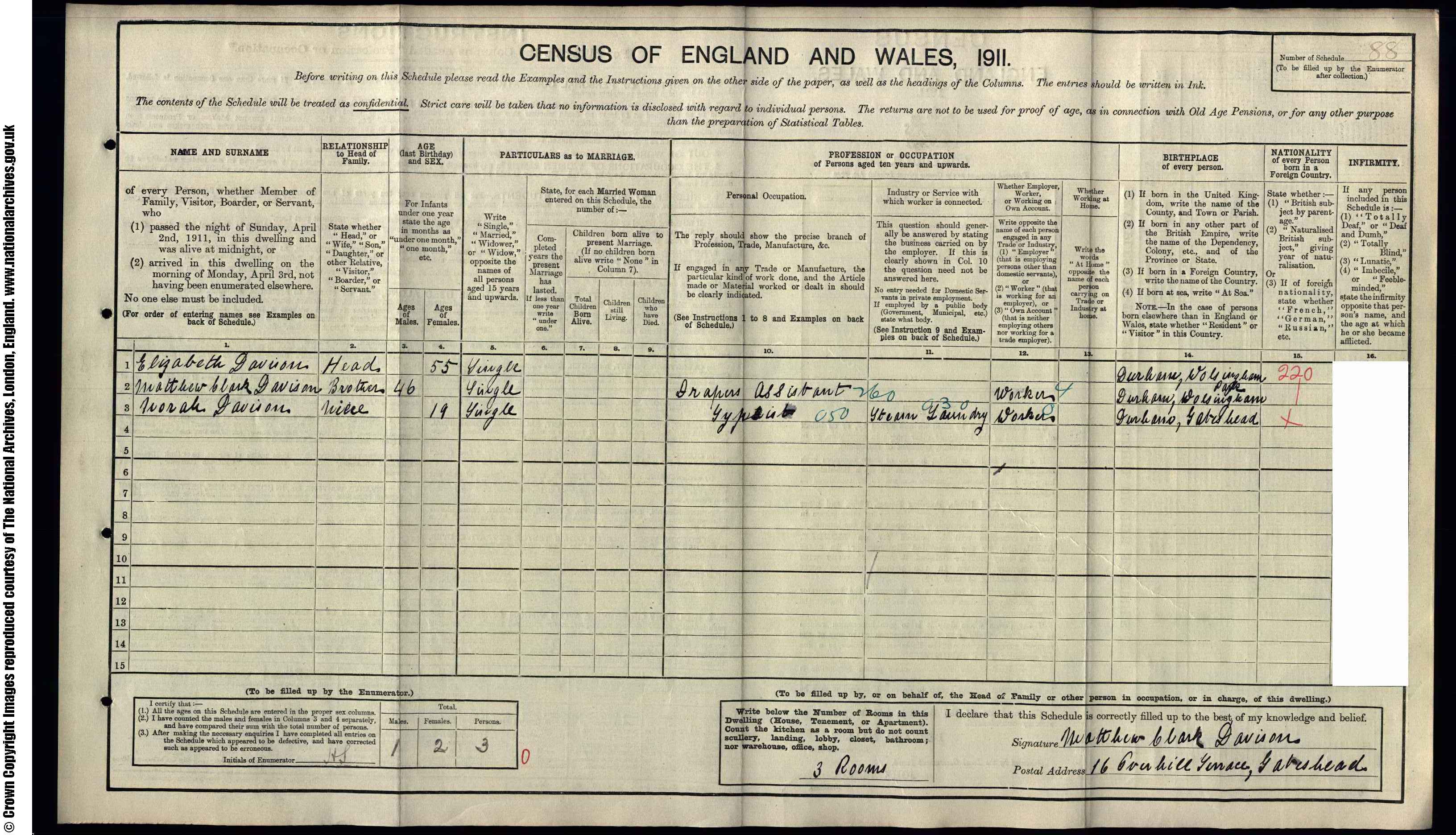 | (Witness) Census 1881 | 3 April 1881 | She appeared in the household of William James Cordner in the 1881 census at Devonshire Buildings, Barrow in Furness, Lancashire, England.1 |