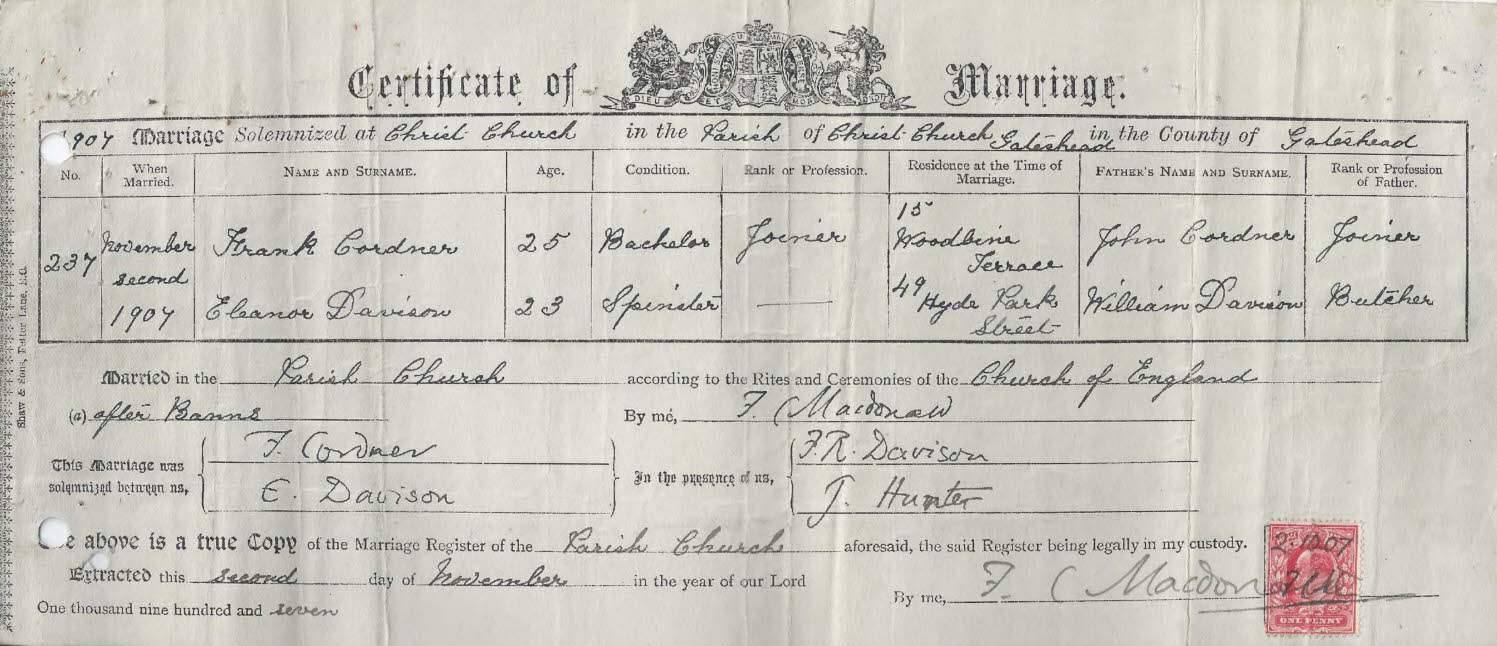 | Marriage | 2 November 1907 | Eleanor Davison married Frank Cordner, son of John Cordner and Mary Elliott, on 2 November 1907 at Christ Church, Gateshead, Co Durham, England; Christ Church Gateshead entry 237 Frank Cordner 25 Bachelor Joiner 15 Woodbine Terr John Cordner Joiner Eleanor Davison 23 Spinster 49 Hyde Park St William Davison Butcher both signed in presence of F R Davison J Hunter.4 |
