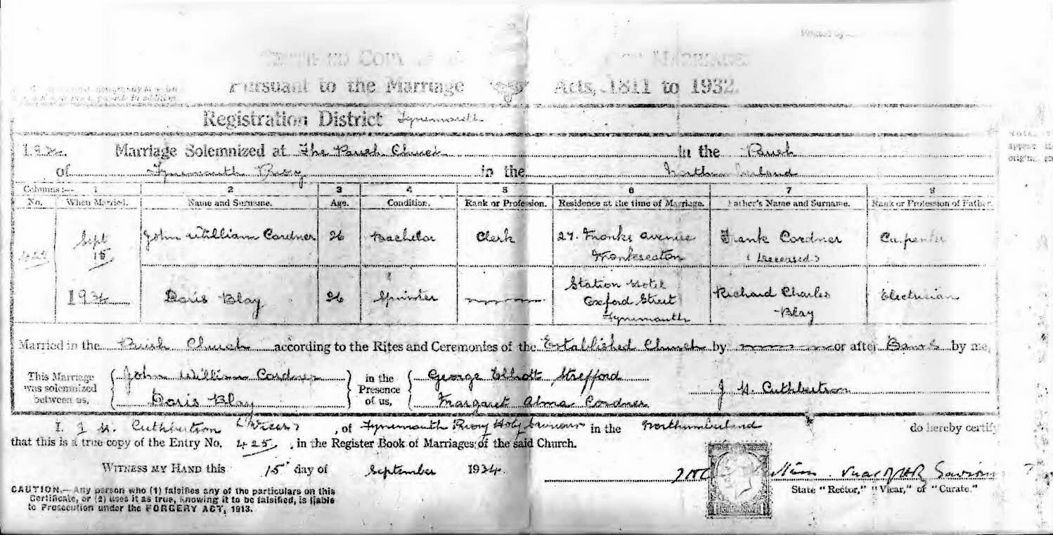 | Birth* | 12 August 1908 | John William Cordner was born on 12 August 1908 at 15 Woodbine Terrace, Gateshead, Co Durham, England; (sub-district & district Gateshead entry 67) . John William Boy Frank Eleanor Joiner informant 22/8/1908 Cordner Cordner (Journeyman) father formerly Davison.1 Registration District Gateshead 1908 Birth in the Sub=District of Gateshead in the County of Gateshead No 67 Twelfth August 1908 John Boy Frank Eleanor Joiner Frank Twenty Thomas 15 Woodbine Terrace William Cordner Cordner (Journeyman) Cordner Second Lumsden U.D. formerly Father August Registrar Davison 15 Woodbine 1908 Terrace Gateshead Certified as a true copy of entry 67 in the register book 314 |