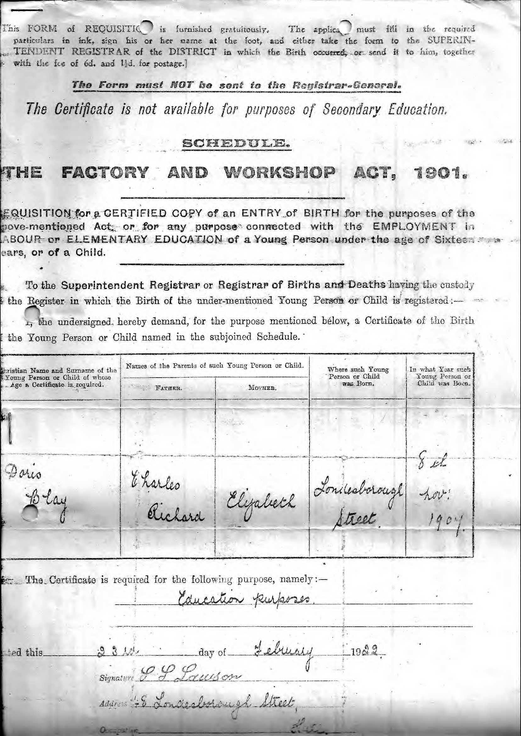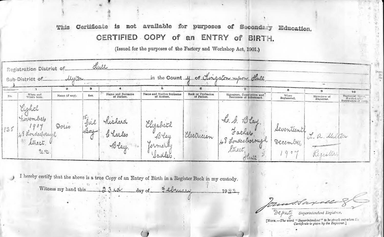 | Birth* | 8 November 1907 | She was born on 8 November 1907 at 48 Londesborough Street, Hull, Yorkshire, England.1 Certified Copy of an Entry of Birth Registration District of Hull Sub-District of Uyton in the County of Kingston upon Hull No 135 Eighth Doris 15. Richard Elizabeth Electrician RC Blay Seventeenth November Girl Charles Blay Father December 1907 Blay formerly 48 Londesborough 1907 48 Londesborough Sadler Street Street Hull U.D. |