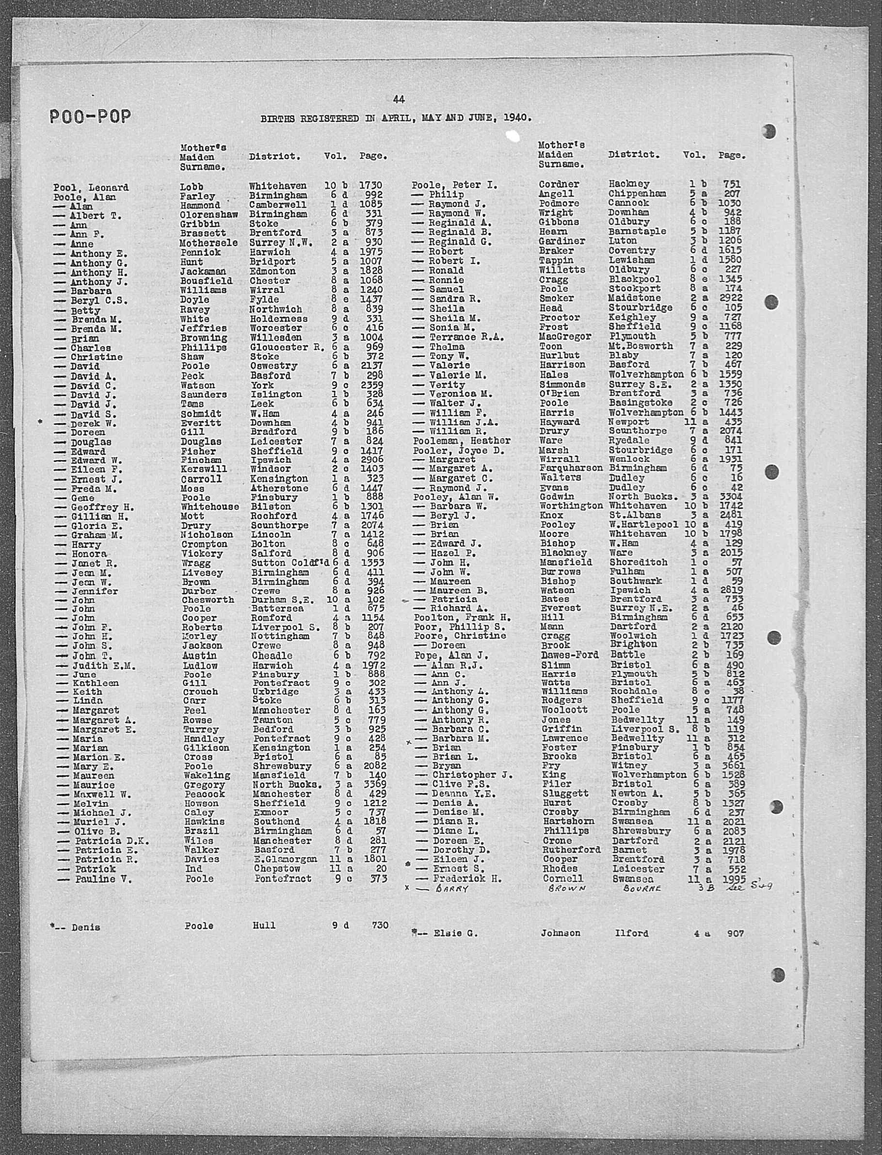 Record Transcription: England & Wales Births 1837-2006 First name(s) PETER I Last name POOLE Birth year 1940 Birth quarter 2 Registration month - Mother's maiden name Cordner District Hackney County London Country England Volume 1B Page 751 Record set England & Wales Births 1837-2006 Category Birth, Marriage, Death & Parish Records Subcategory Civil Births Collections from Great Britain, England © brightsolid online publishing ltd | ||