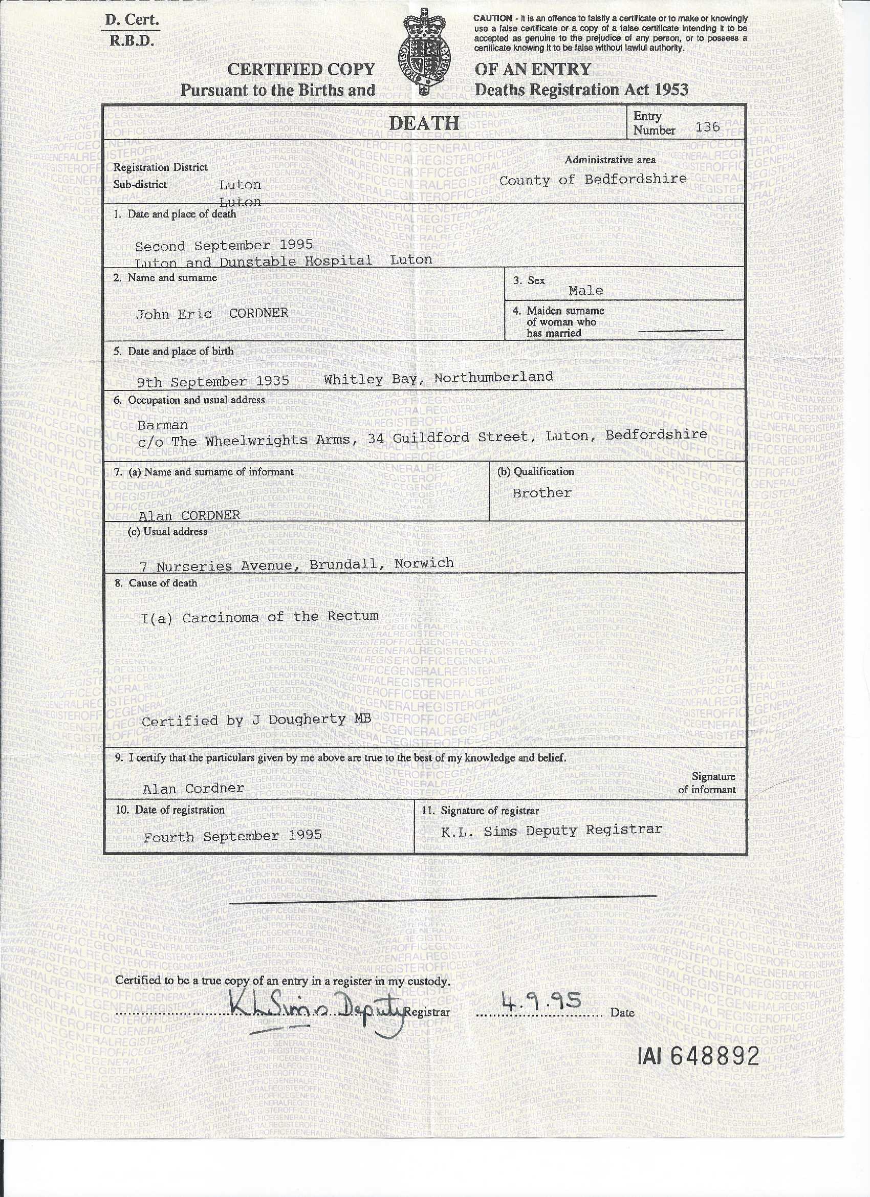 | Birth* | 13 November 1937 | Richard Frank Cordner was born on 13 November 1937 at West Monkseaton, Whitley Bay. |