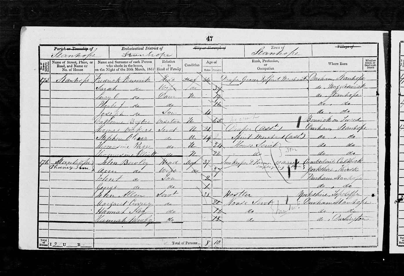 ALLENBY, Sarah Head Married19 years F 55 1856 Boarding House Keeper Stanhope Durham