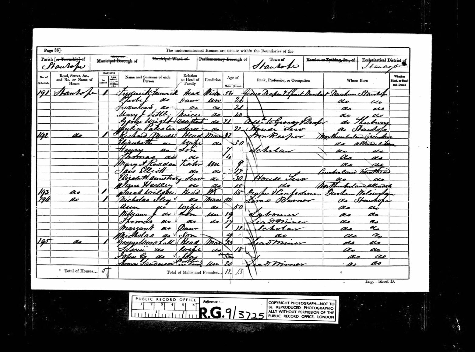 MYERS, Sarah Head Widow F 35 1856 Inn Keeper Stanhope, Weardale