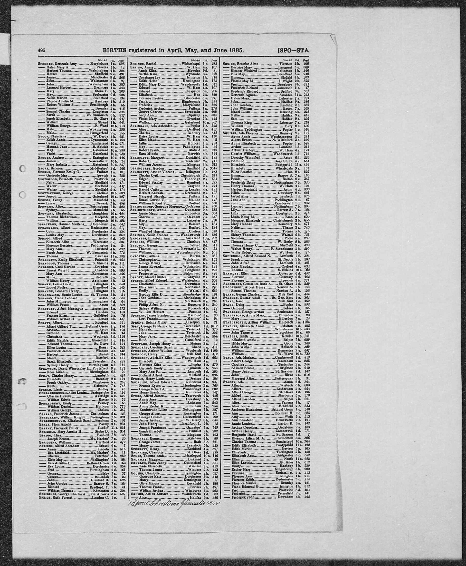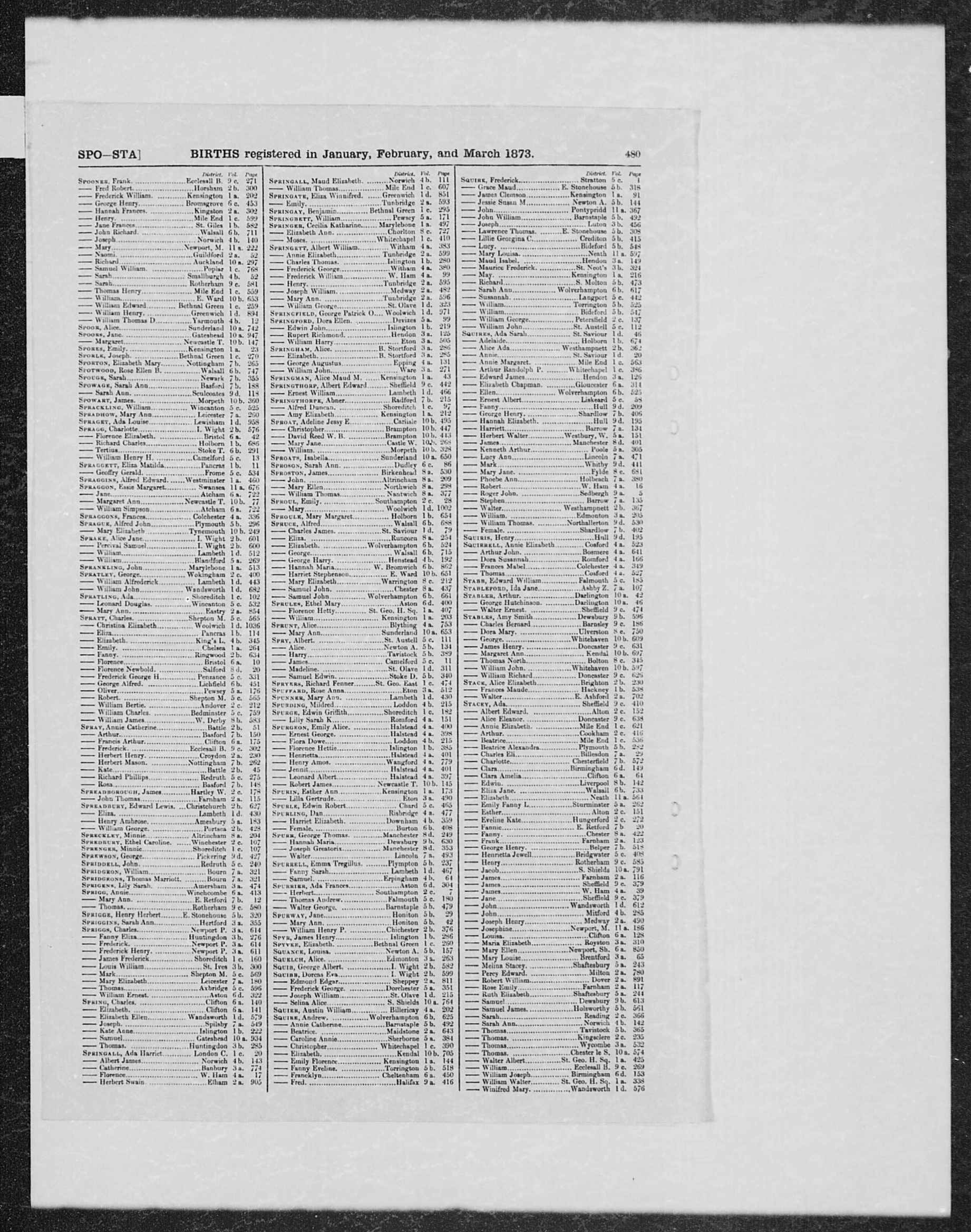 England & Wales births 1837-2006 Transcription First name(s) JAMES Last name SPREADBOROUGH Birth year 1873 Birth quarter 1 Registration month - Mother's last name Goddard [given by new style GRO Indexes] District Hartley Wintney County Hampshire Country England Volume 2C Page 178 Record set England & Wales Births 1837-2006 Category Birth, Marriage, Death & Parish Records Subcategory Civil Births Collections from Great Britain, England © Findmypast |